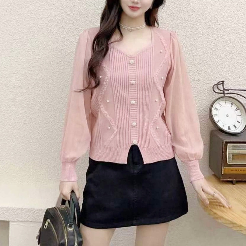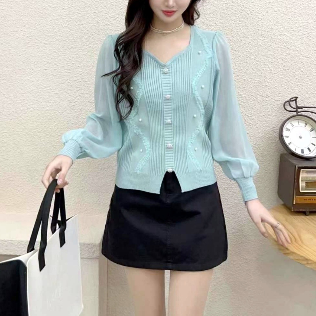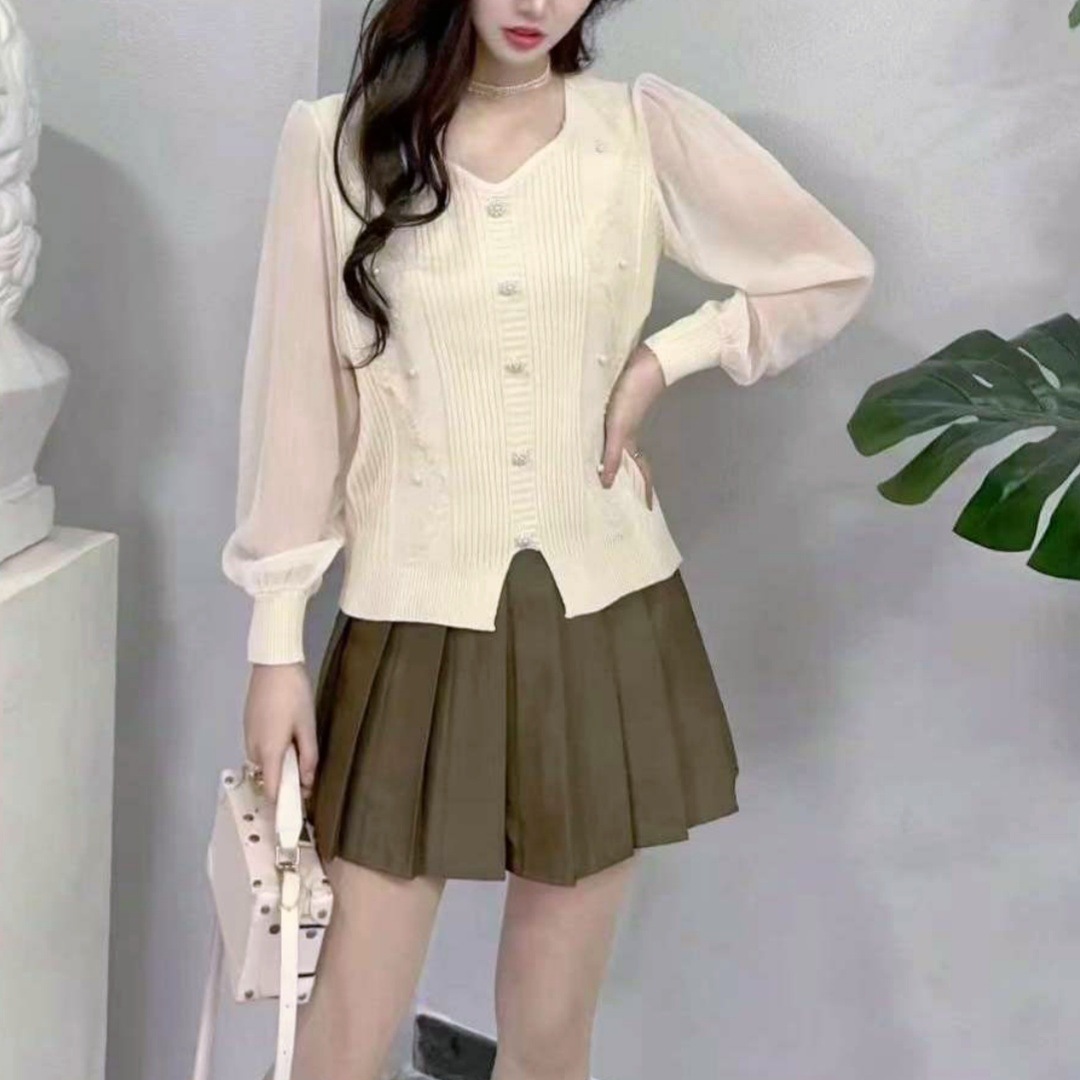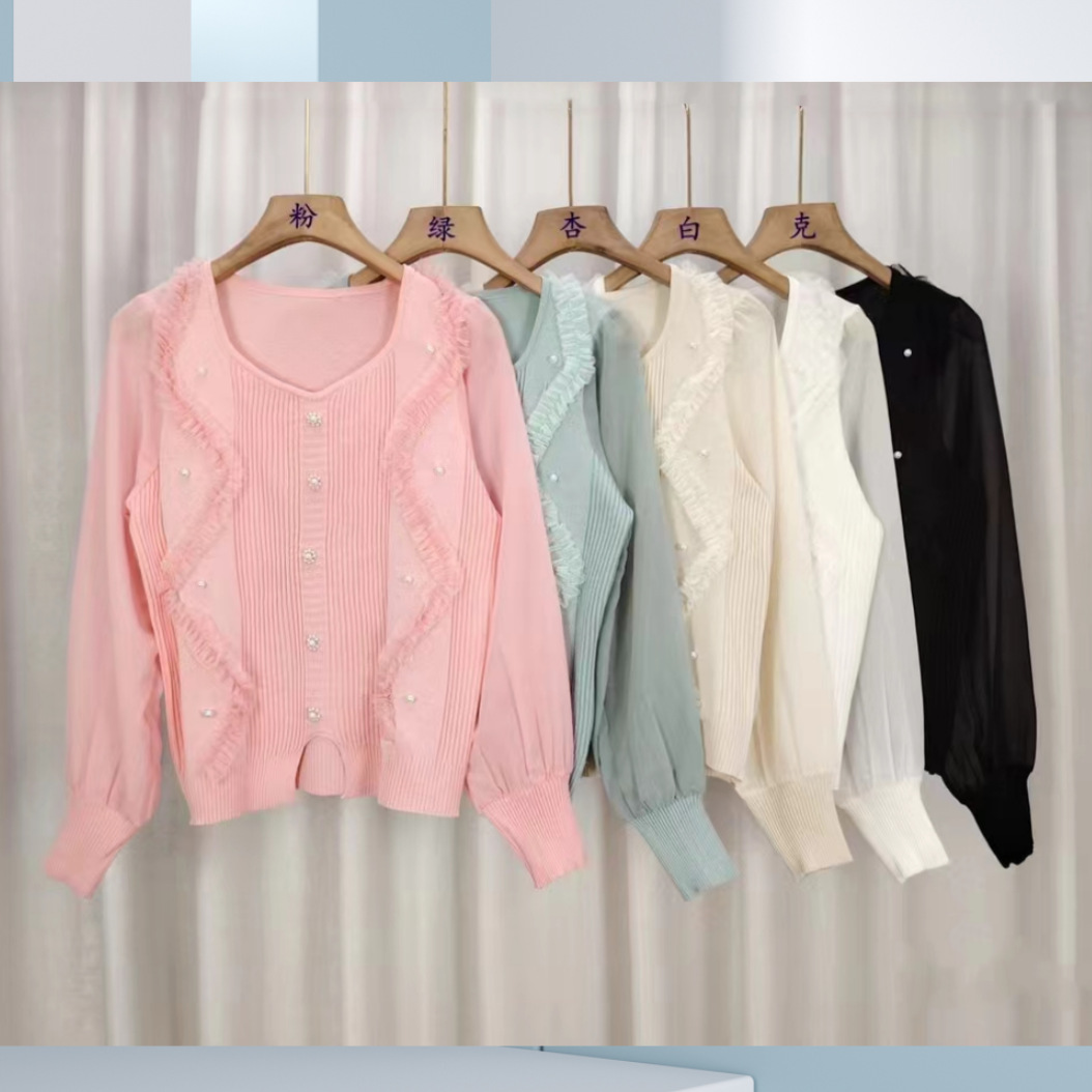 2024 봄과 여름 스티칭 슬리밍 새로운 샤넬 스타일 긴 소매 스티칭 쉬폰 프랑스 스타일 스웨터 배꼽 커버 탑스토어 가기