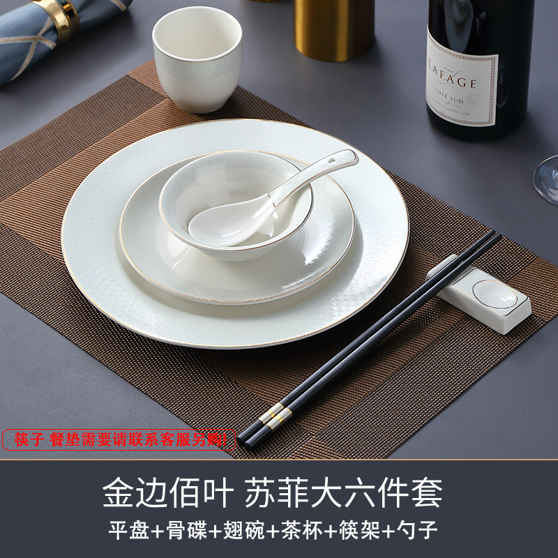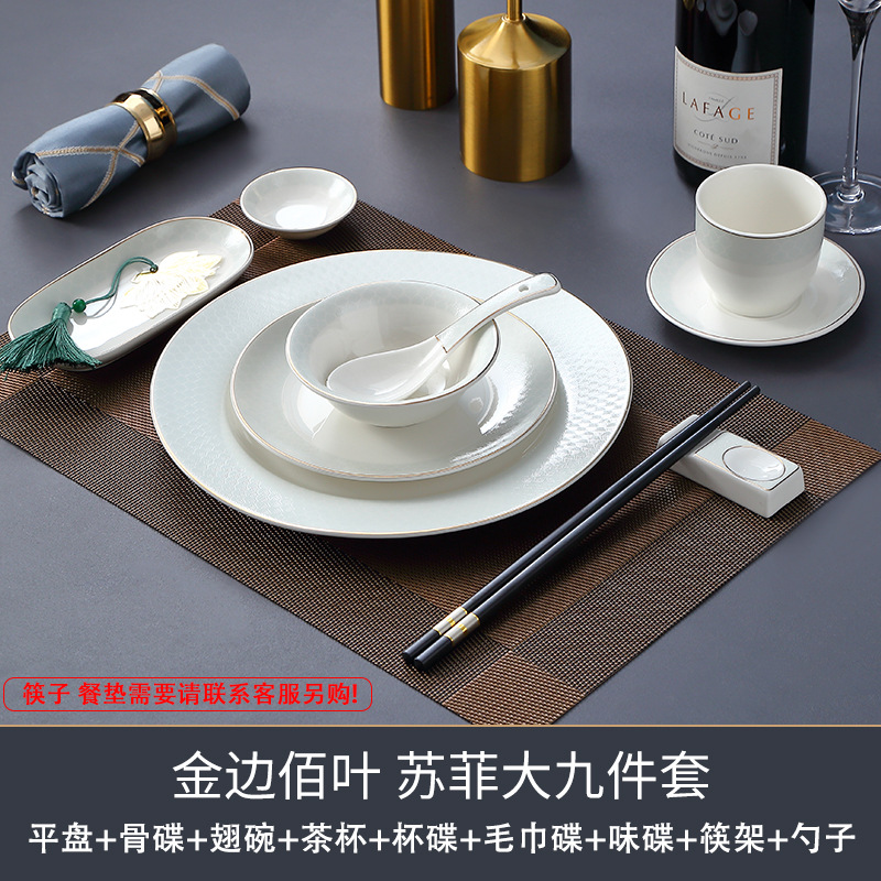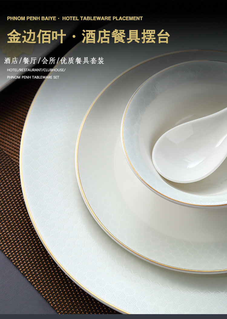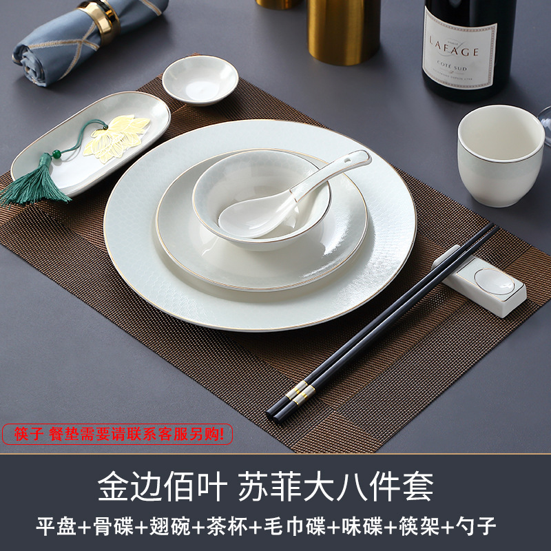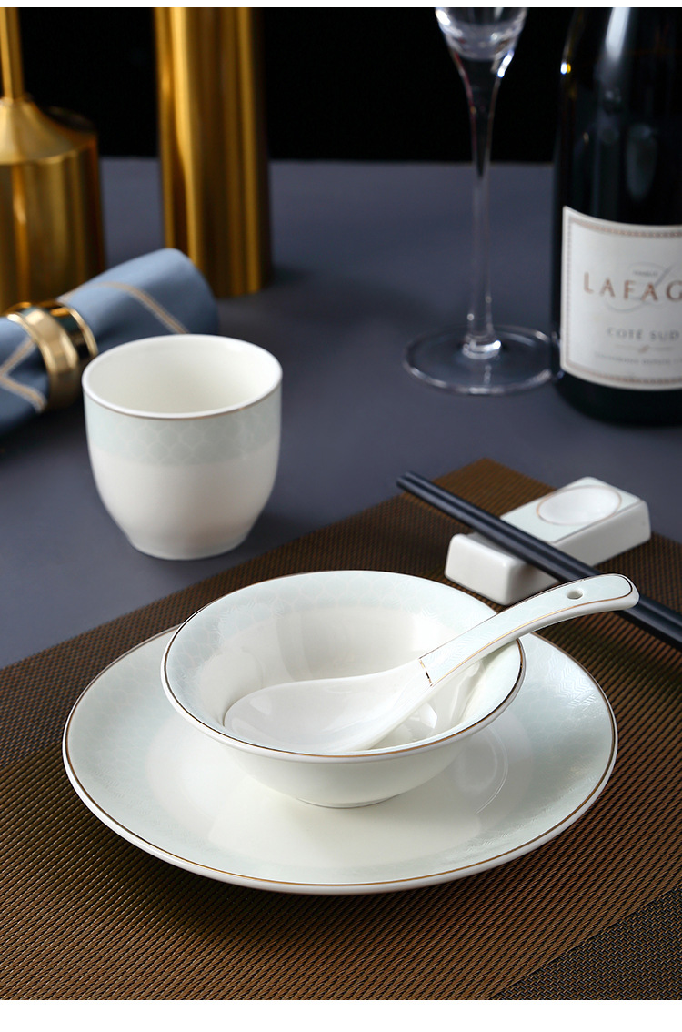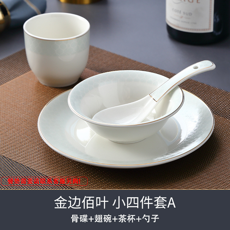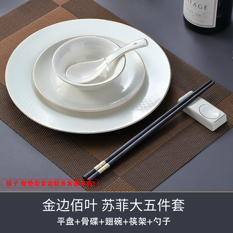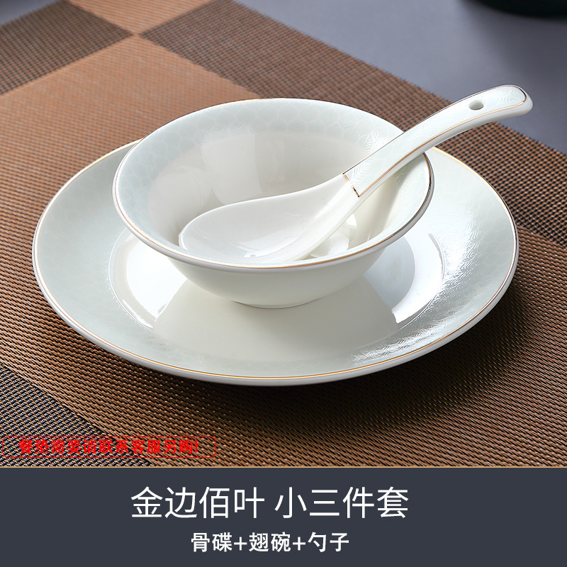 호텔 테이블 장식 식기 세트 중국 스타일 하이 엔드 클럽 황금 가장자리 그릇 접시 숟가락 플레이트 3 피스 세라믹 인쇄 세트