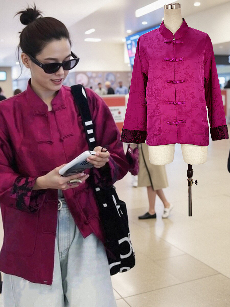 재고 Xin Zhilei 같은 스타일의 스탠드 칼라 새로운 중국 스타일 버클 Hanfu 탑 고귀한 보라색 스타일 Tang 세트 자카드 코트스토어 가기
