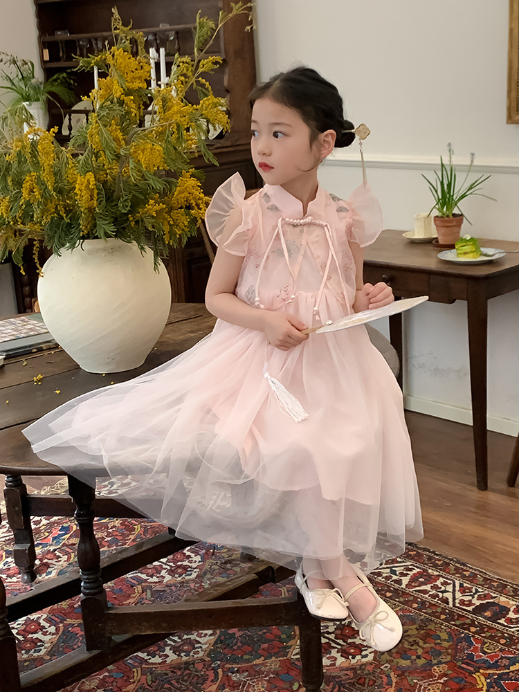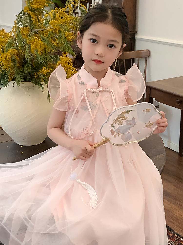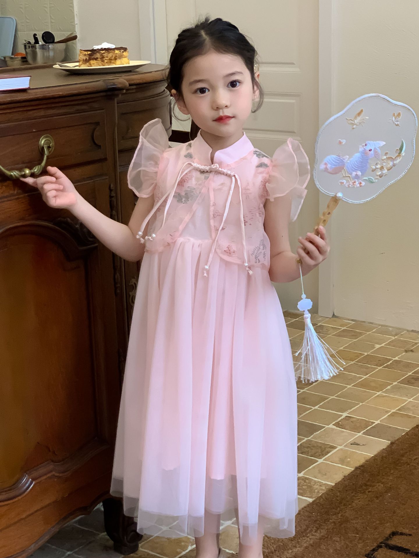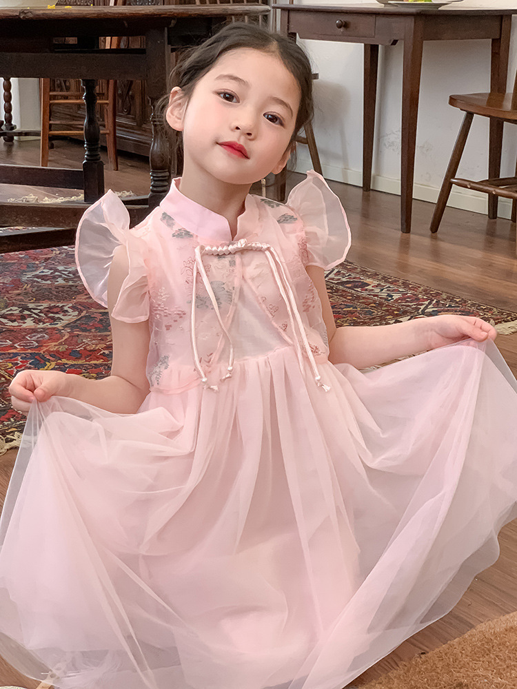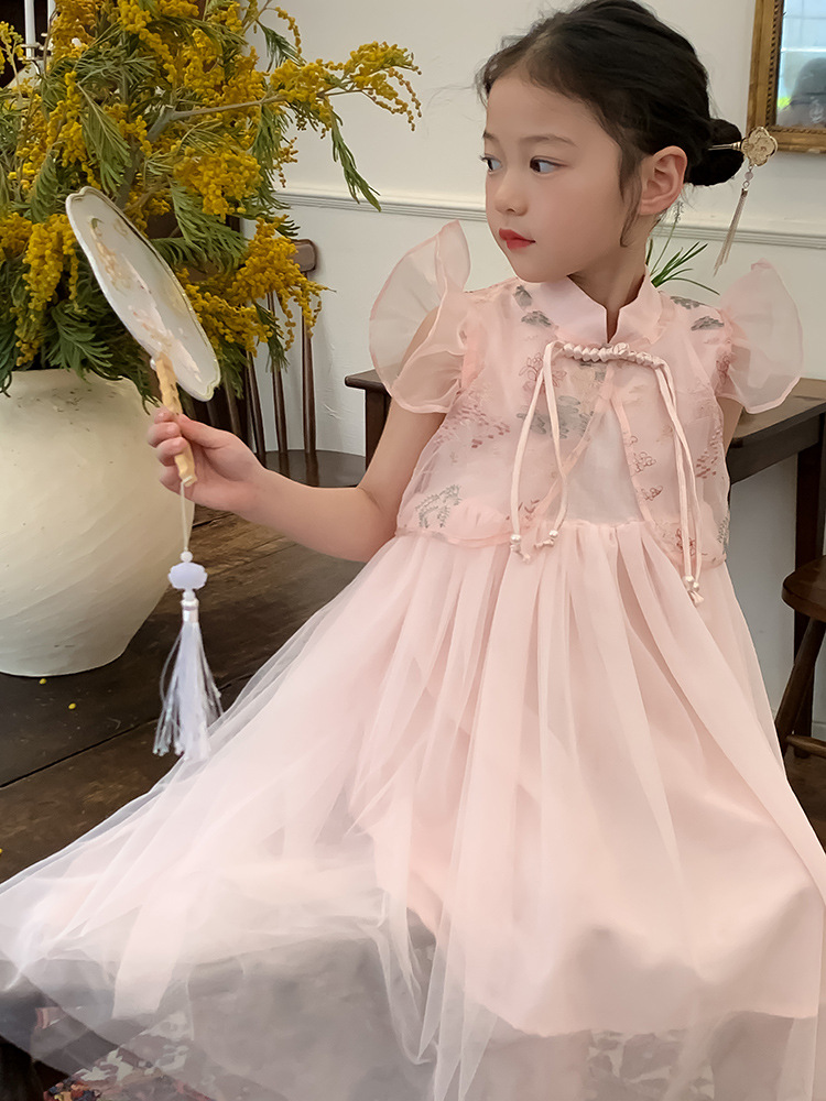 꽃과 여자를 찾고 청삼 칼라 원피스 2024 새로운 스타일 서양식 중국 스타일 거즈 스커트 달콤한 어린이 공주 스커트