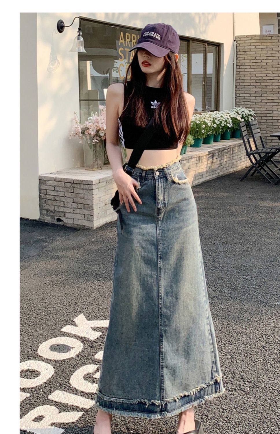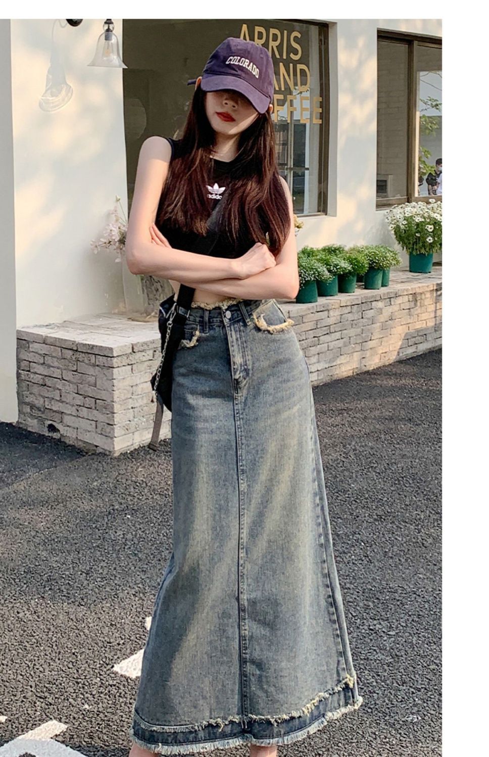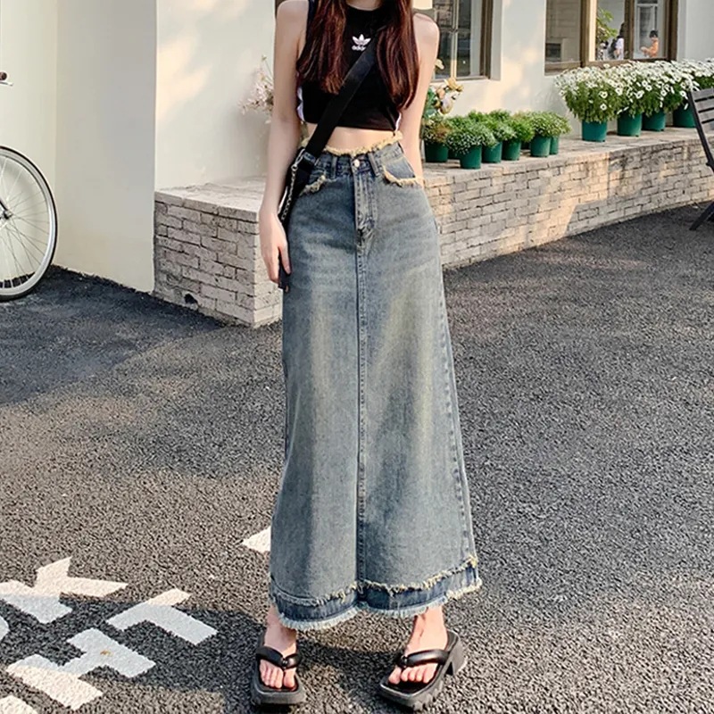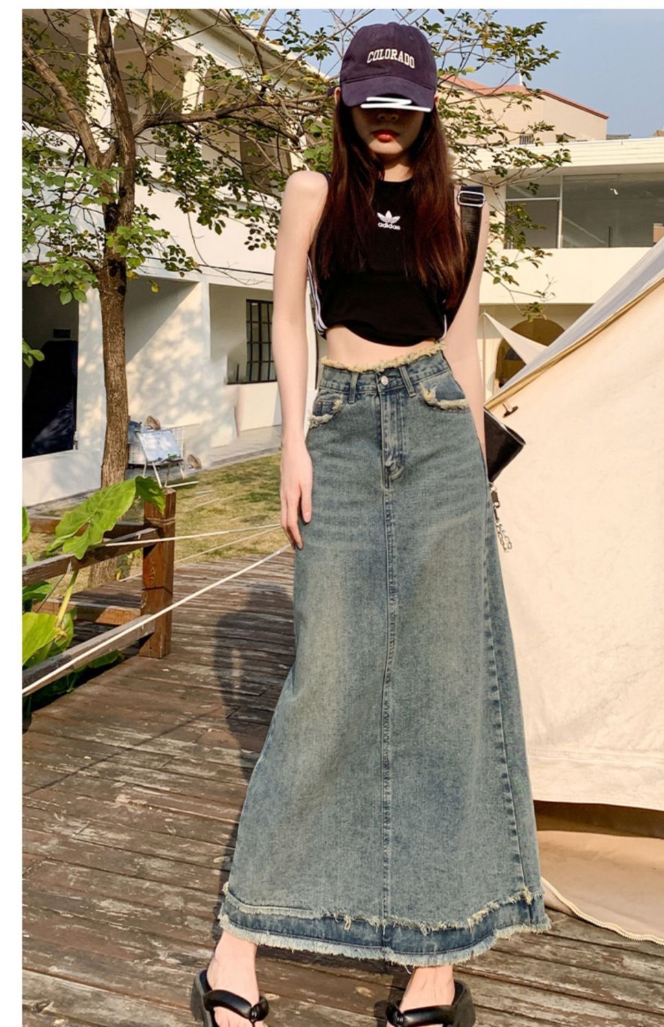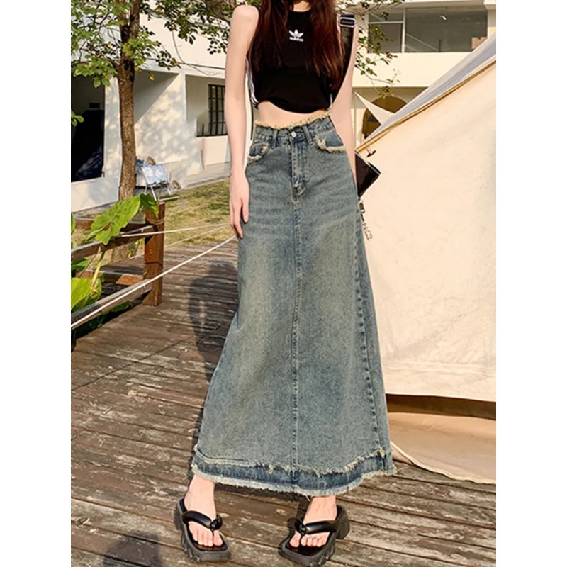 2024 봄 새로운 복고풍 하이 허리 디자인 닳은 데님 스커트 여성 튀김 거리 캐주얼 A-라인 원피스스토어 가기