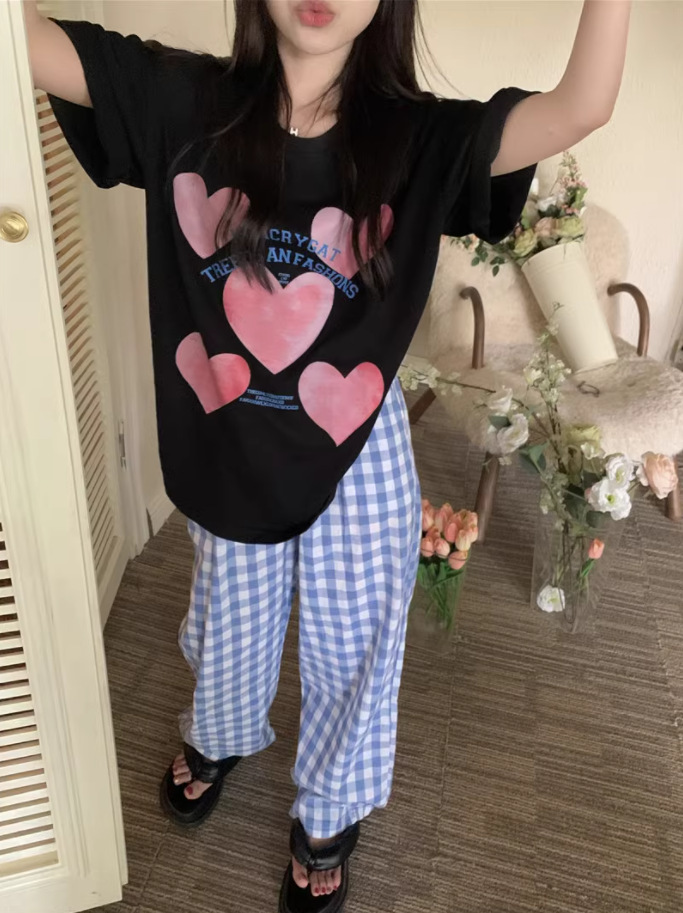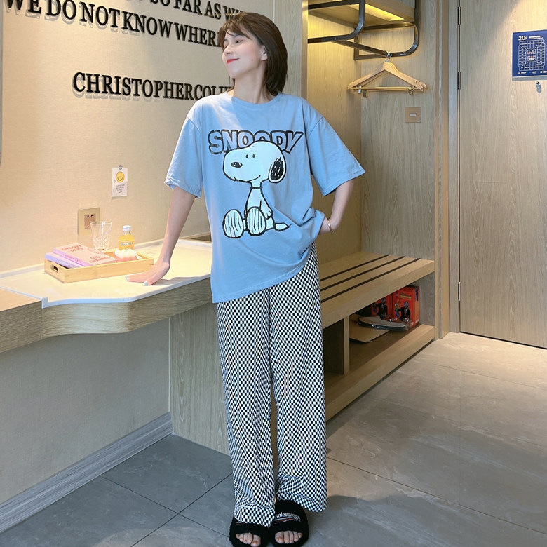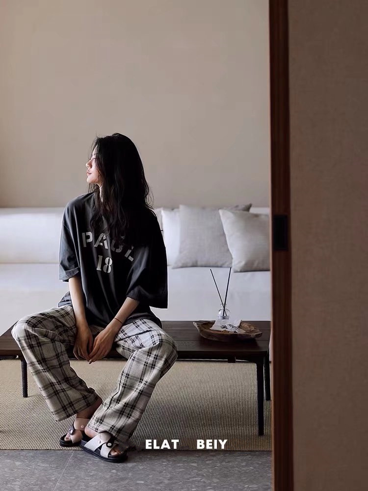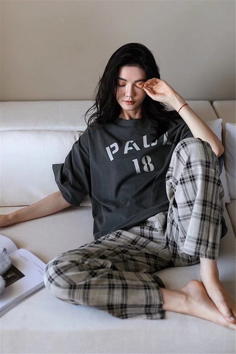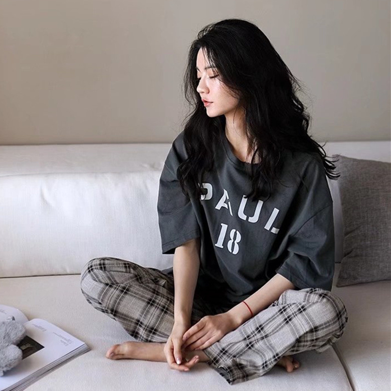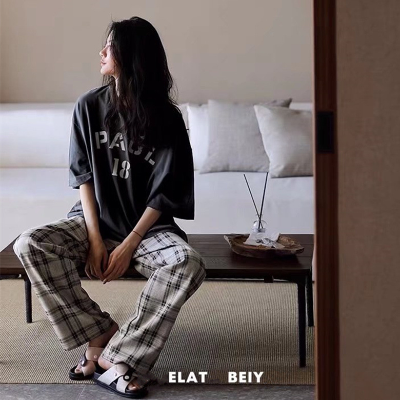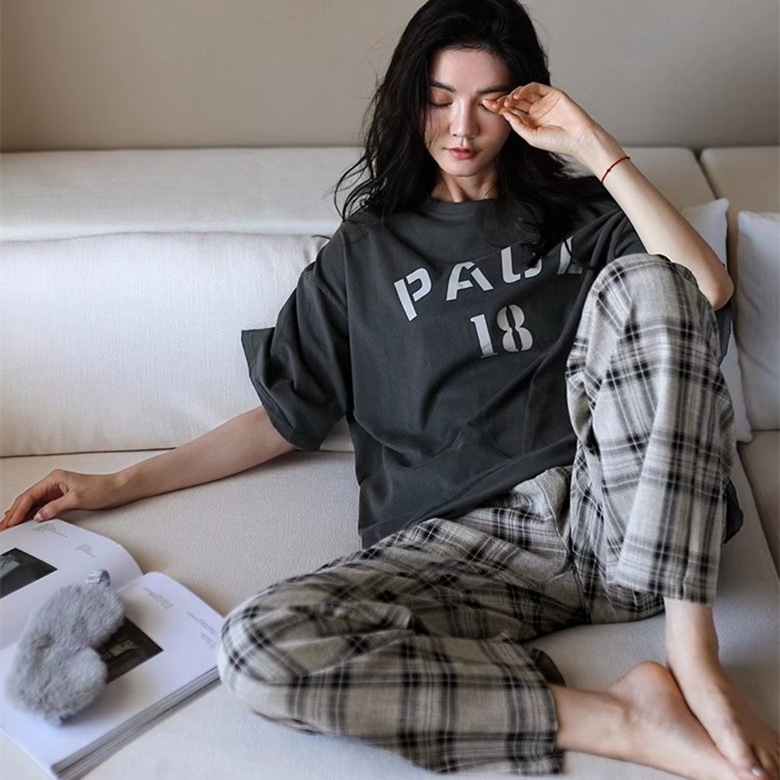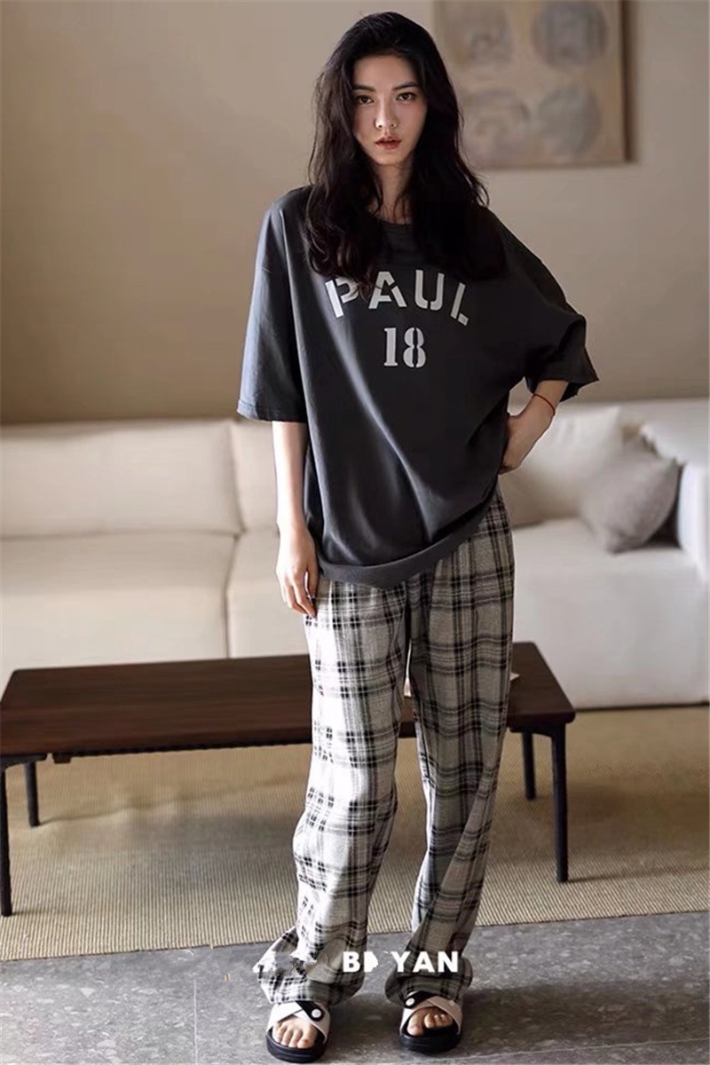여름 잠옷 여성 격자 무늬 반팔 바지 느슨한 한국 스타일 s 스타일 패션 온라인 빨간색 야외 가정복 대외 무역스토어 가기