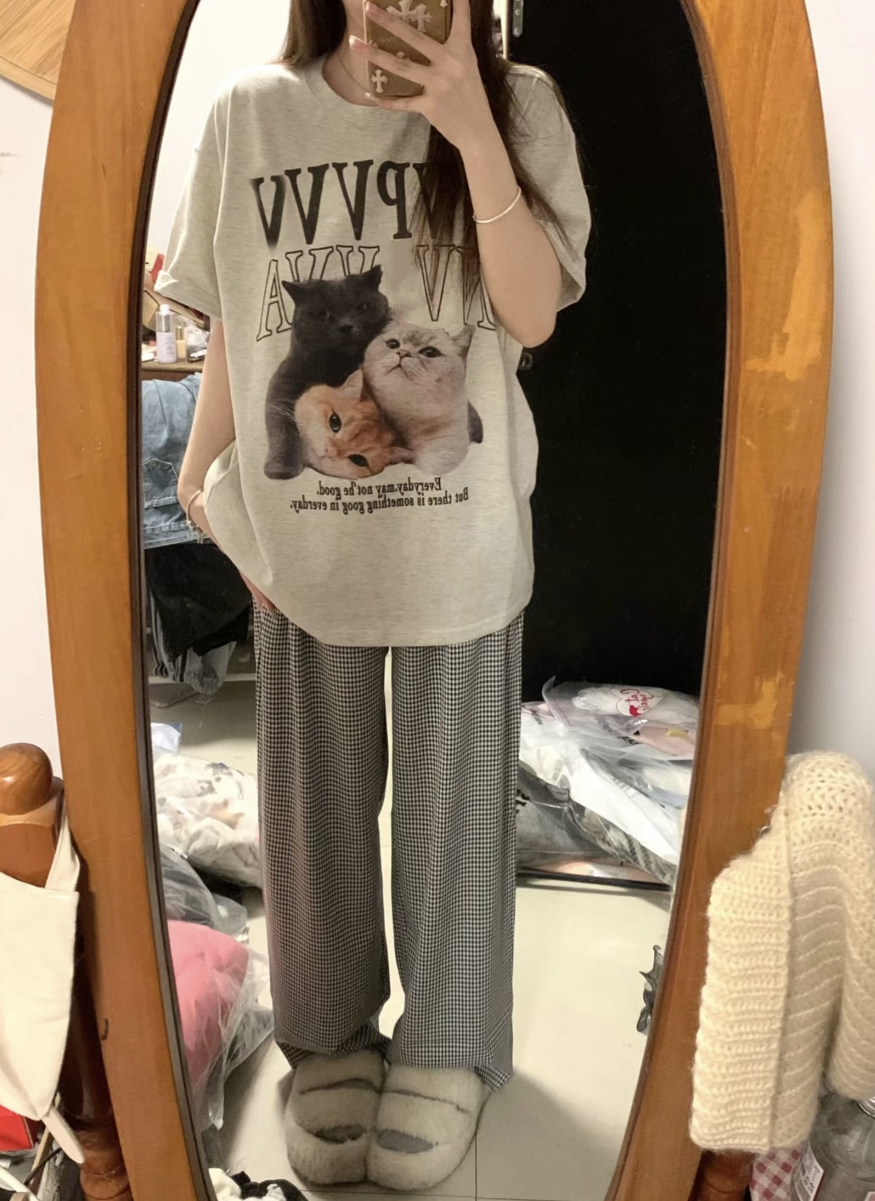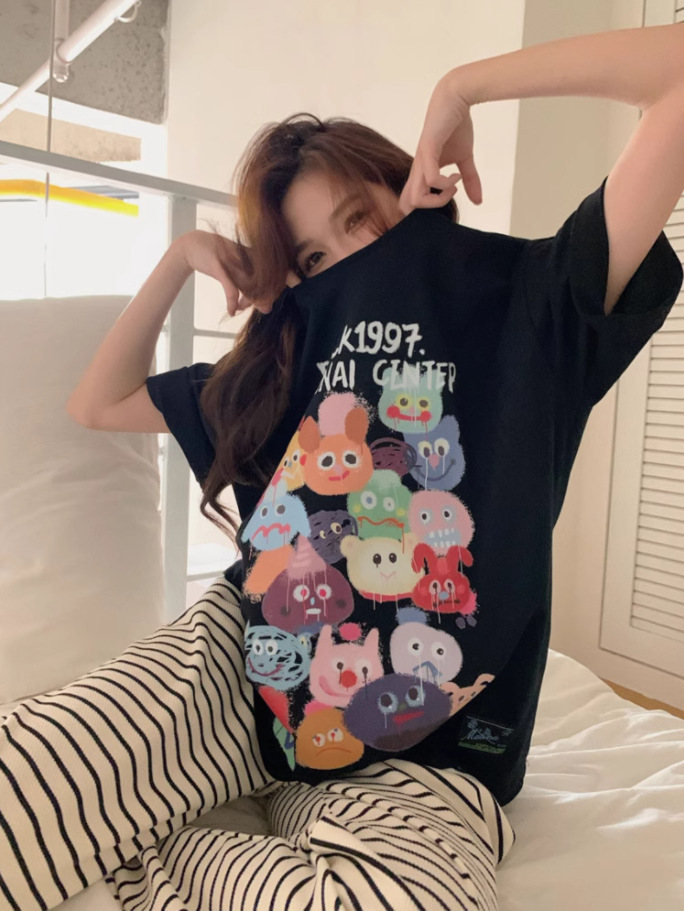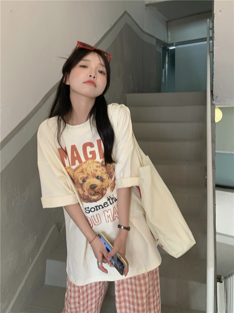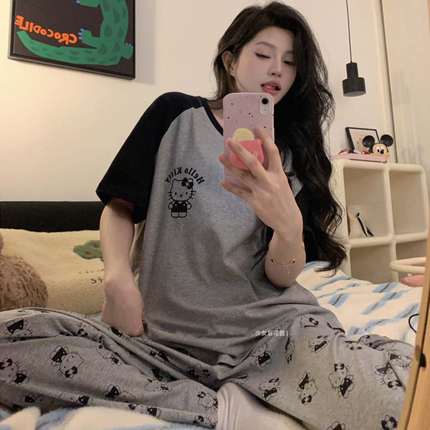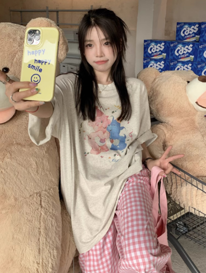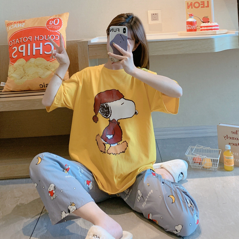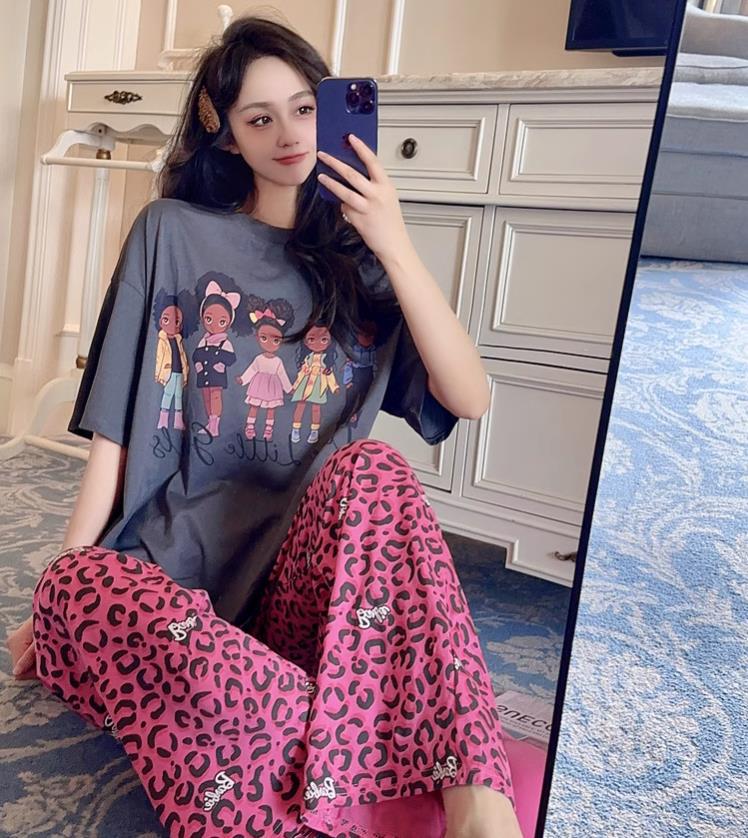 여름 잠옷 여성 격자 무늬 반팔 바지 느슨한 한국 스타일 s 스타일 패션 온라인 빨간색 야외 가정복 대외 무역스토어 가기
