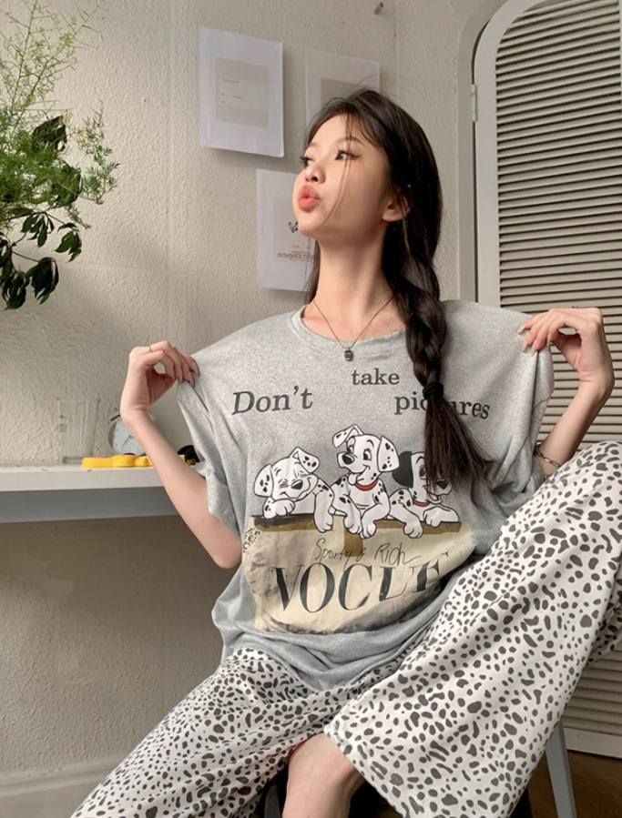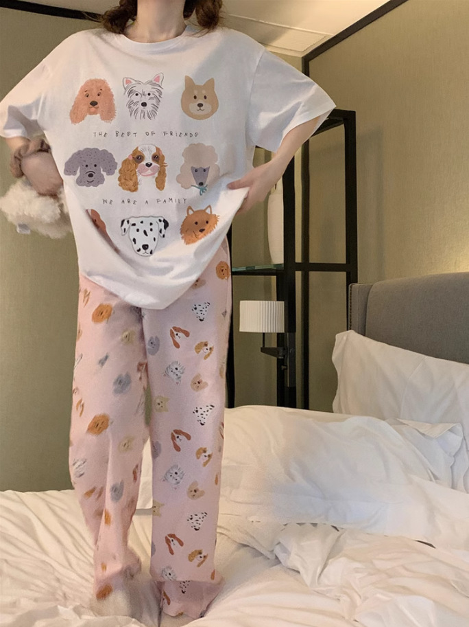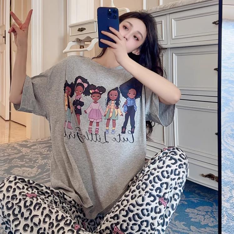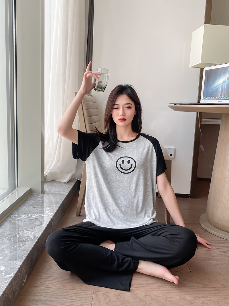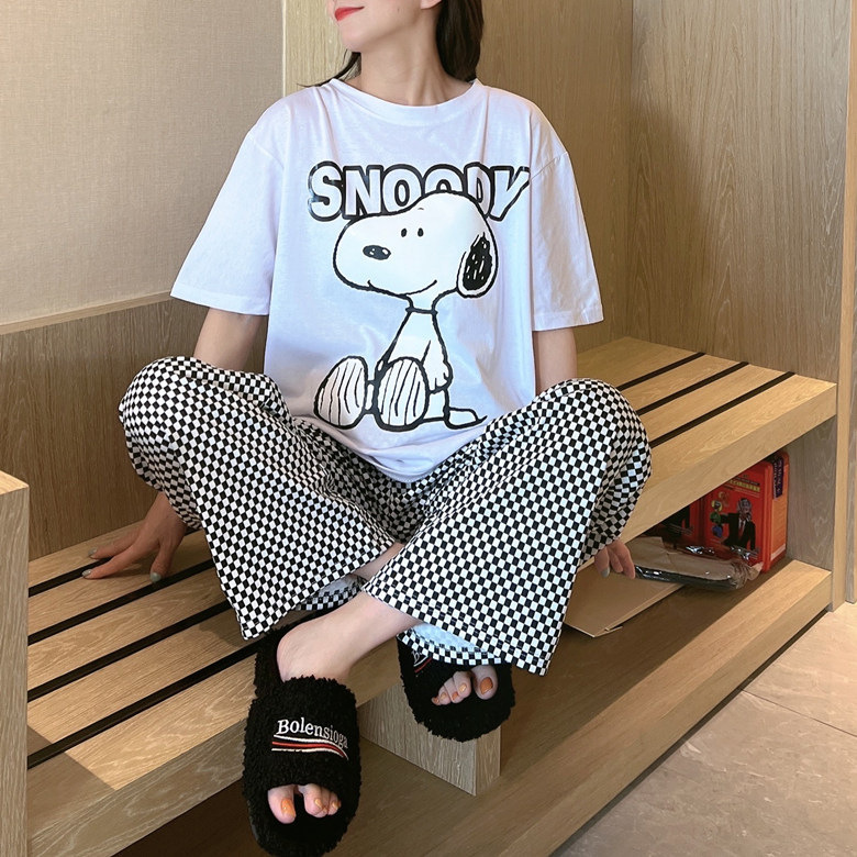 여름 잠옷 여성 격자 무늬 반팔 바지 느슨한 한국 스타일 s 스타일 패션 온라인 빨간색 야외 가정복 대외 무역