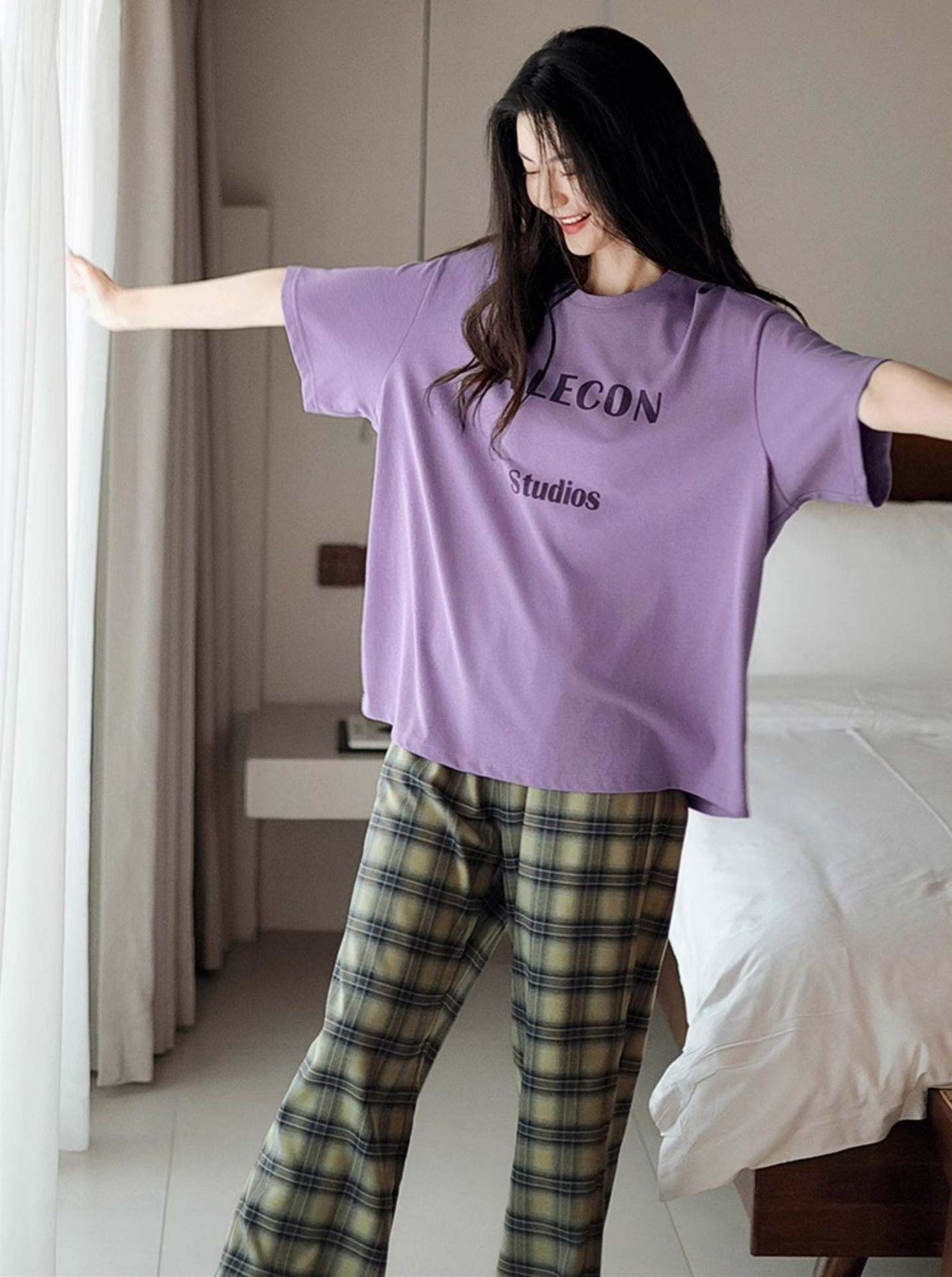 • 보라색 글자 살구색 체크무늬 반바지와 긴 바지