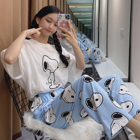 • 짧은 긴 흰색 스누피 블루 꽃 바지