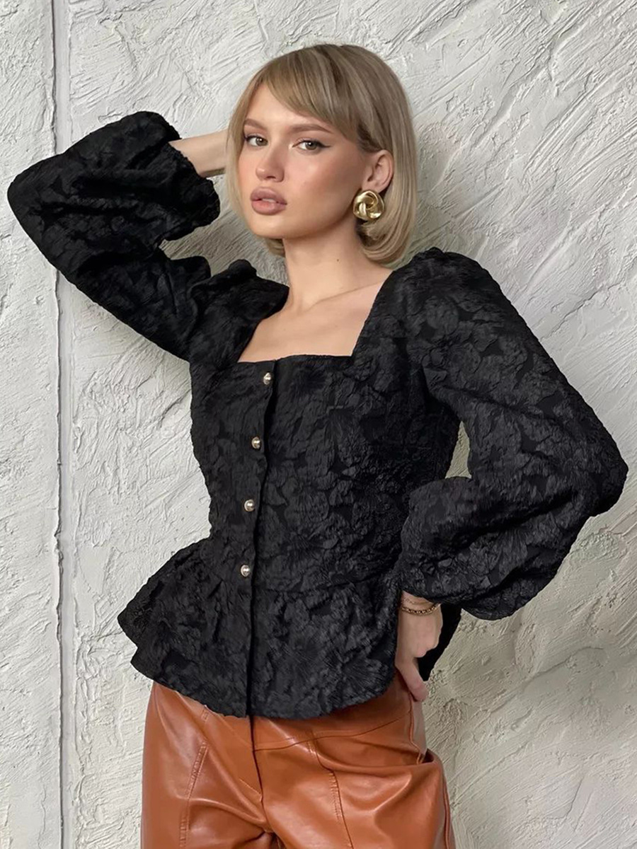 프랑스 스타일의 고급 자카드 셔츠 2024 새로운 통근 스퀘어 칼라 퍼프 소매 여성 셔츠 탑 봄 여성 의류스토어 가기