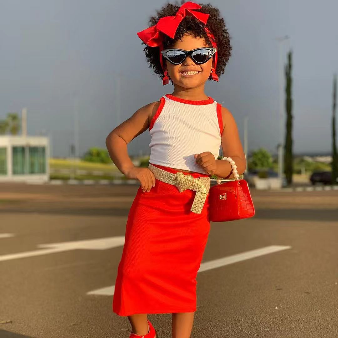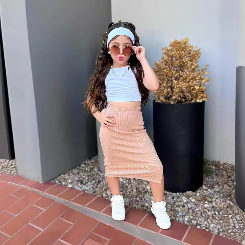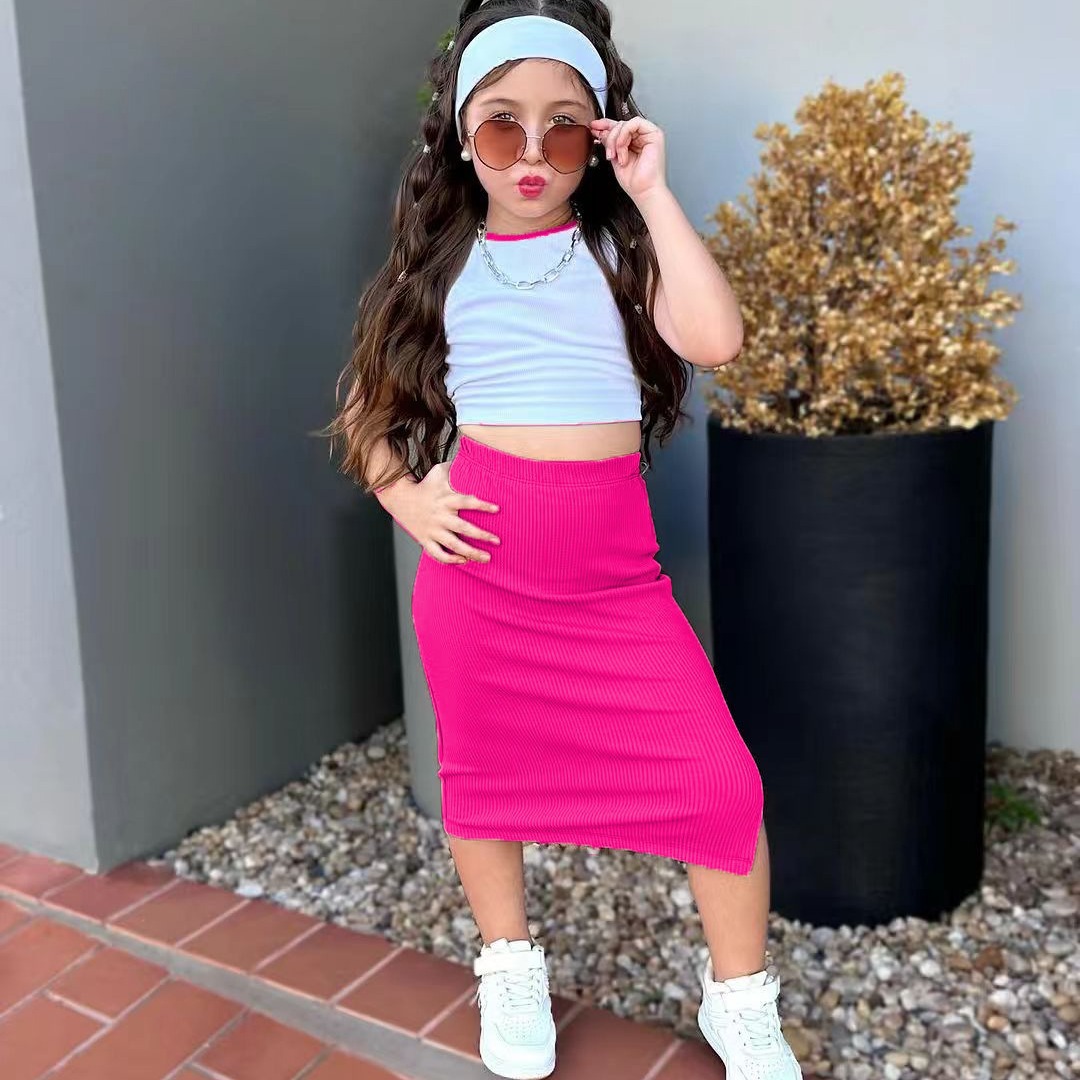 M8093 국경 간 아동복 유럽과 미국 소녀 여름 새로운 컬러 매칭 조끼 스커트 세트 중간 길이 스트레이트 스커트 인 스타일