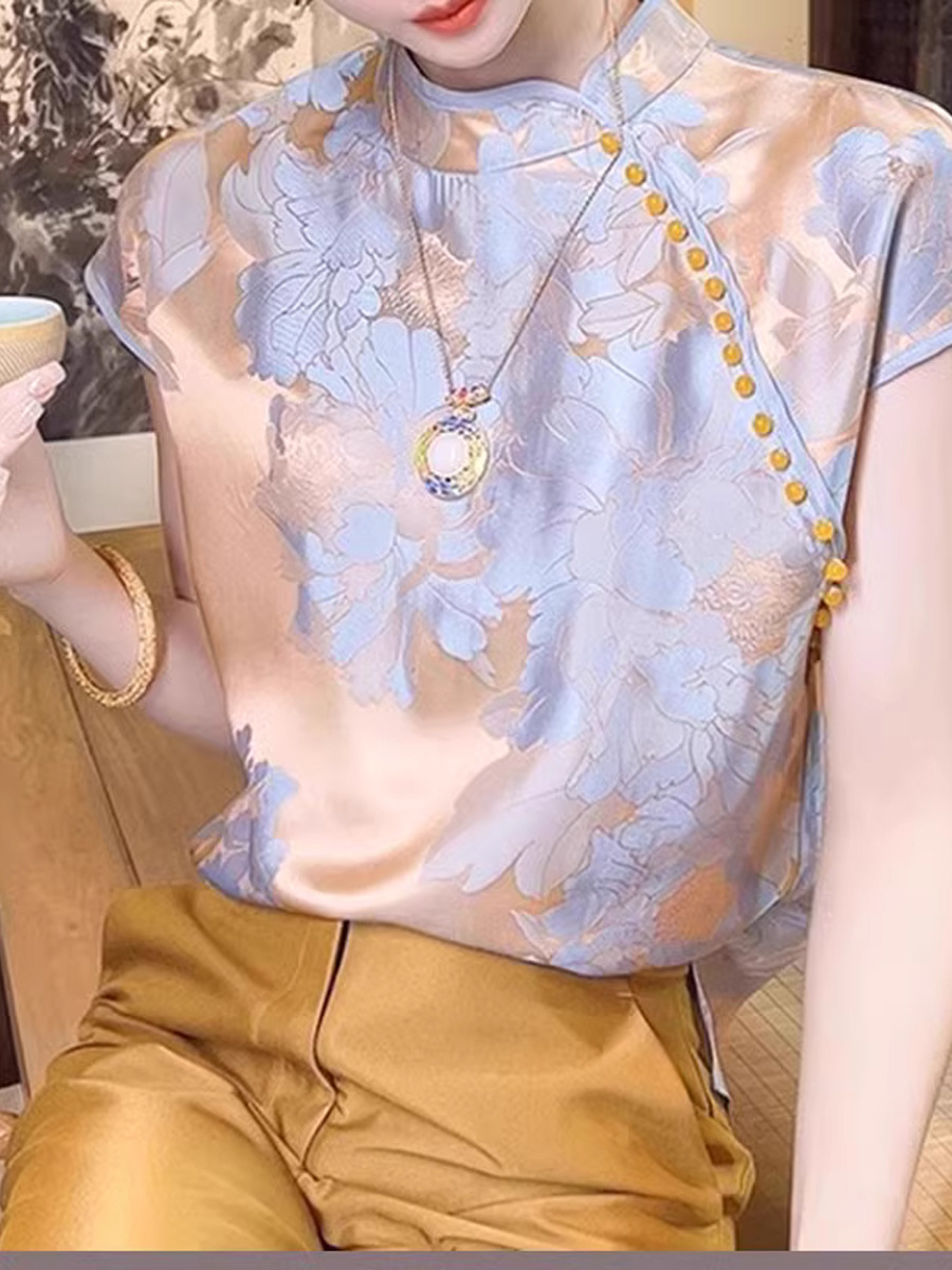 2024 여름 새로운 스타일 자카드 새로운 중국 스타일 빛 국가 스타일 Xiangyun 원사 짧은 소매 여성 셔츠 실크 셔츠