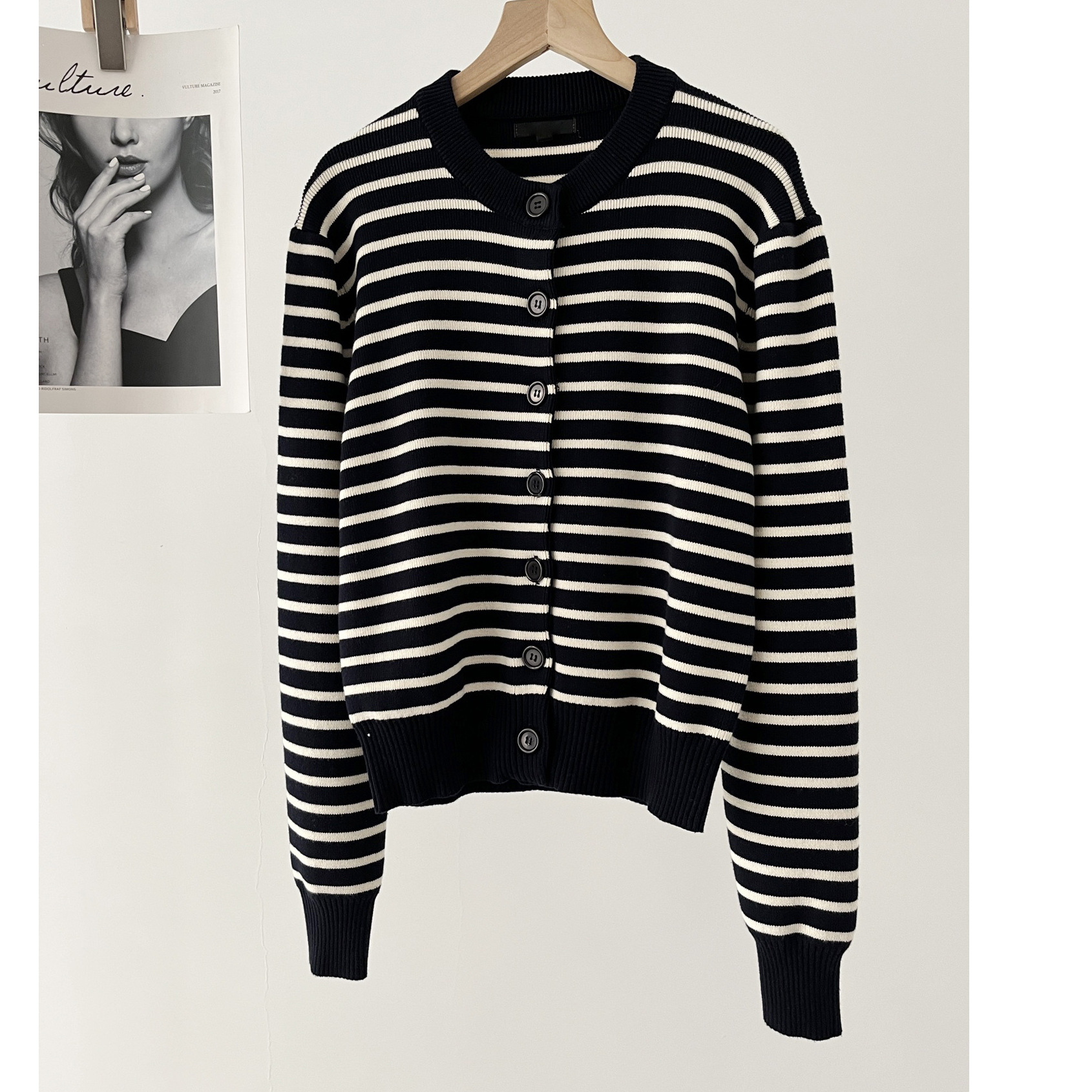 재고 있음 M 스타일 여성 봄 가을 캐주얼 출퇴근룩 스트라이프 스타일 슬림핏 숏 라운드넥 니트 가디건