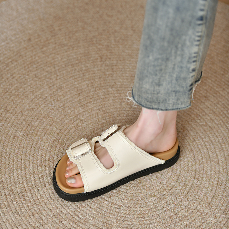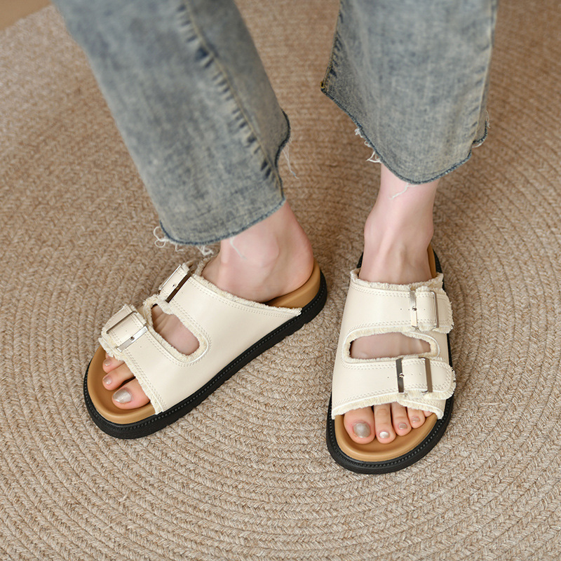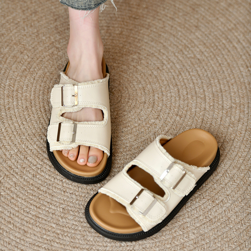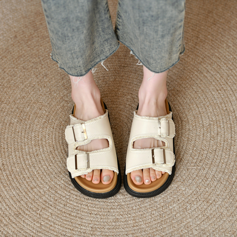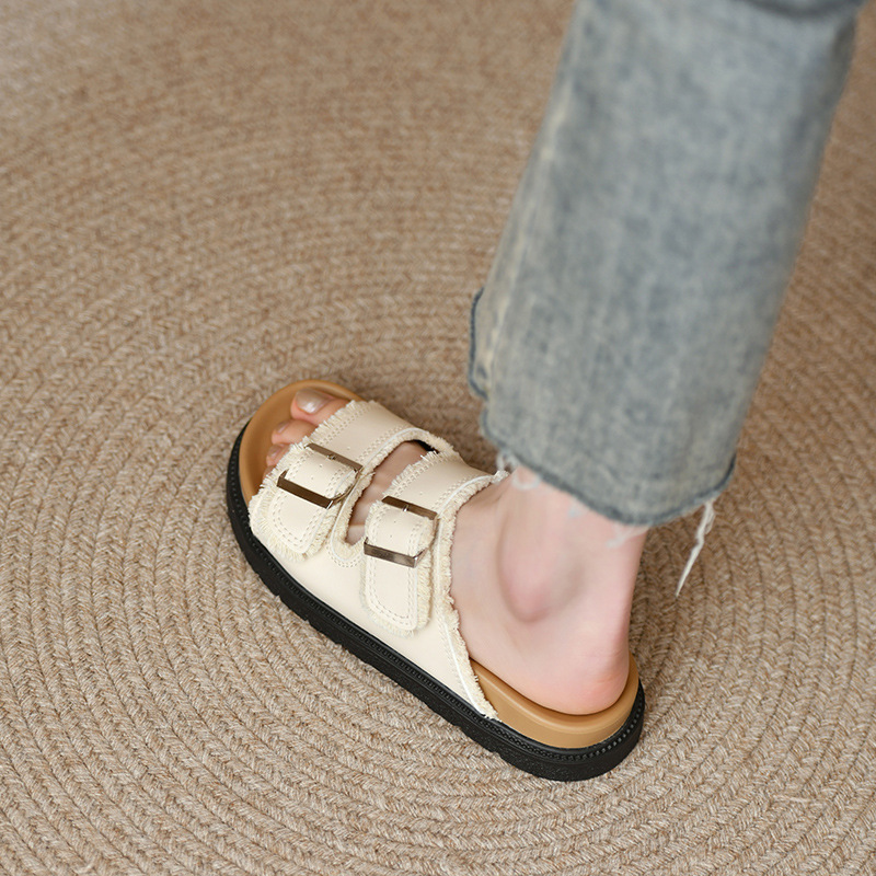 Zhongjia 부드러운 가죽 Boken 신발 여성 여름 부드러운 바닥 게으른 Boken 슬리퍼 두꺼운 바닥 스트랩 야외 해변 샌들 패션