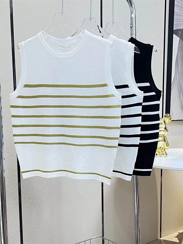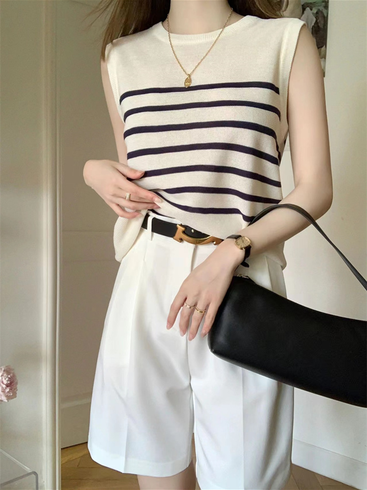 프랑스 세련된 스트라이프 민소매 아이스 실크 스웨터 여성의 여름 얇은 나이-아름다운 서양식 조끼 작은 셔츠 탑 감소