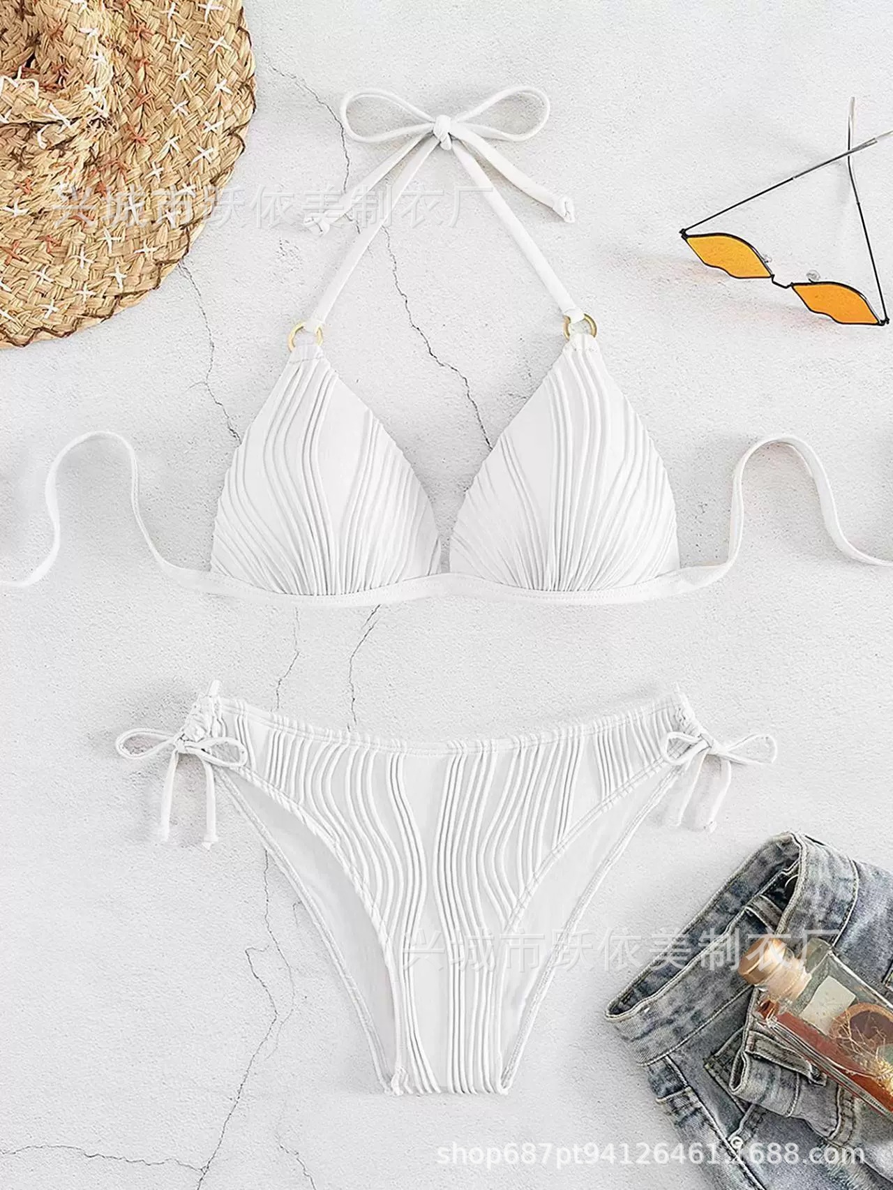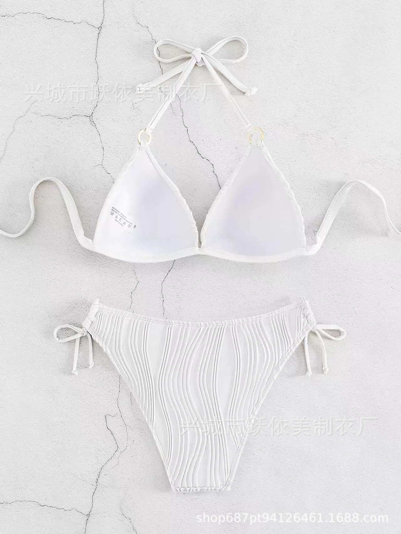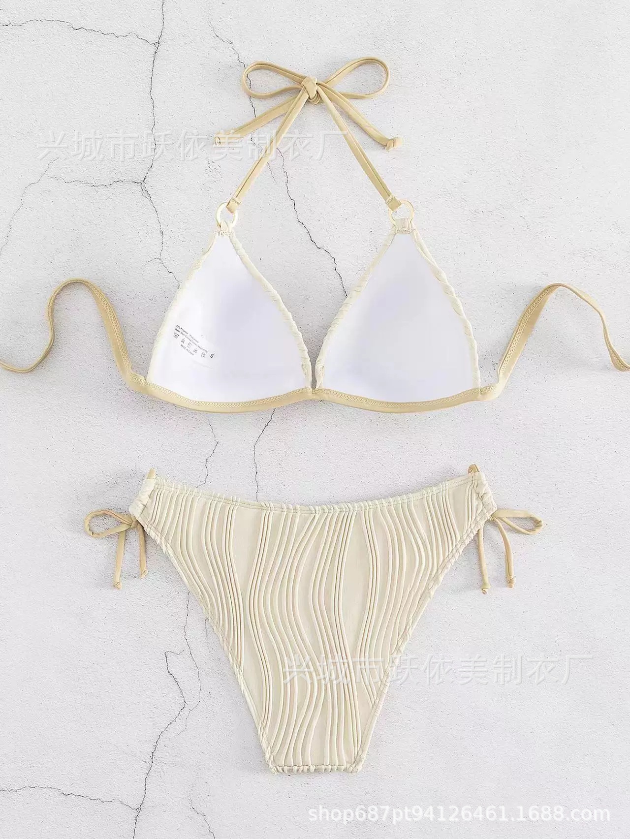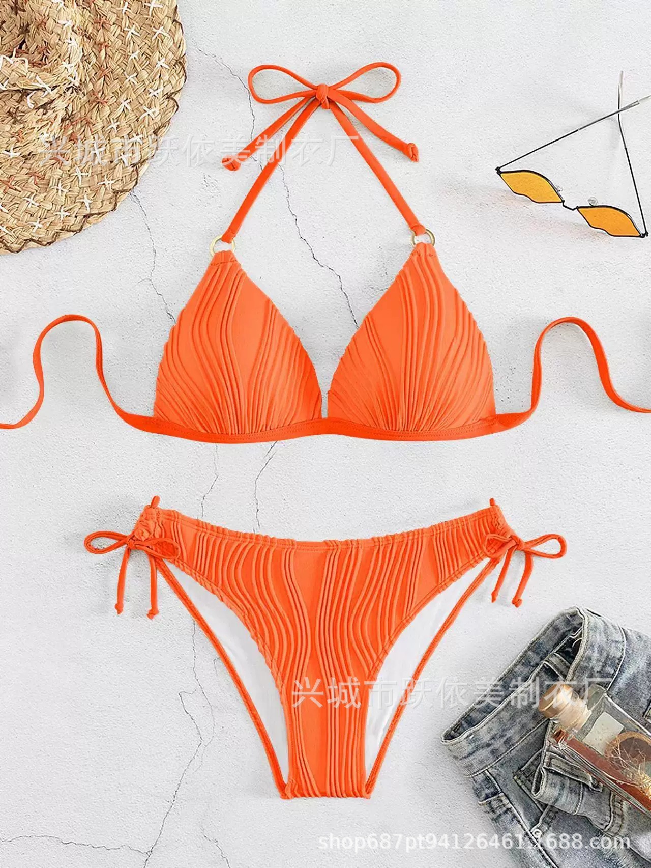 2024 유럽과 미국의 새로운 수영복 크로스 국경 섹시 스플릿 가슴 패드 비키니 캔디 컬러 웨이브 프랑스 3 점스토어 가기