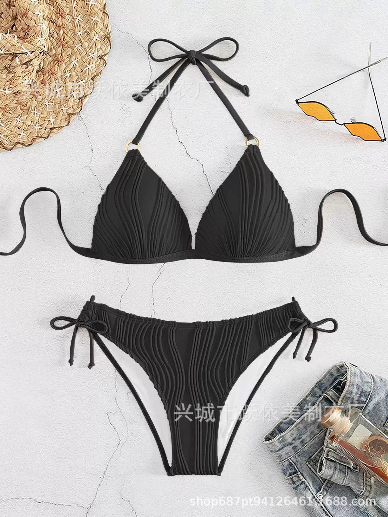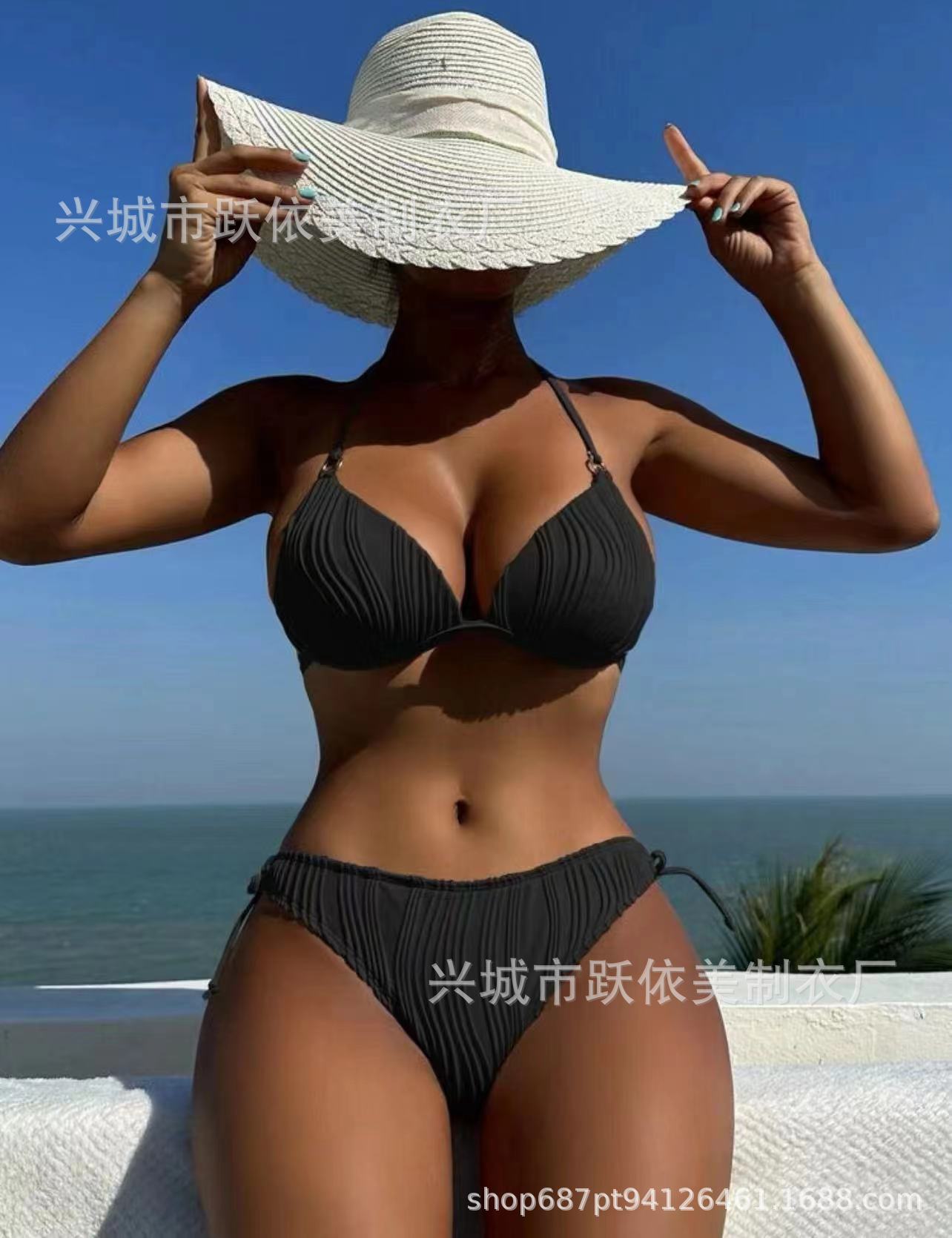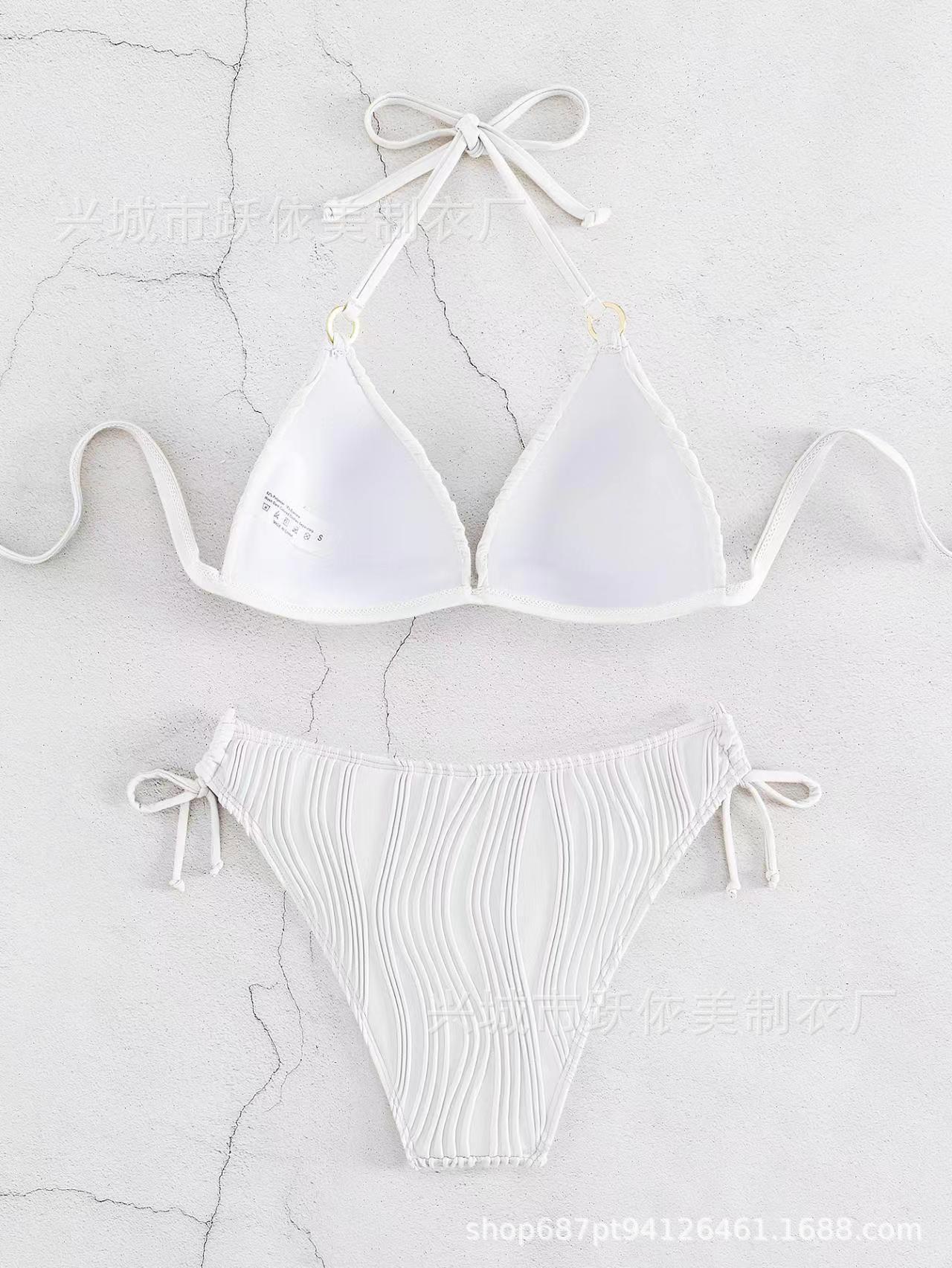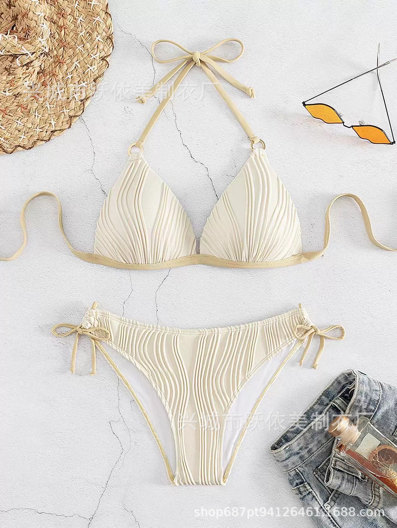 2024 유럽과 미국의 새로운 수영복 크로스 국경 섹시 스플릿 가슴 패드 비키니 캔디 컬러 웨이브 프랑스 3 점스토어 가기