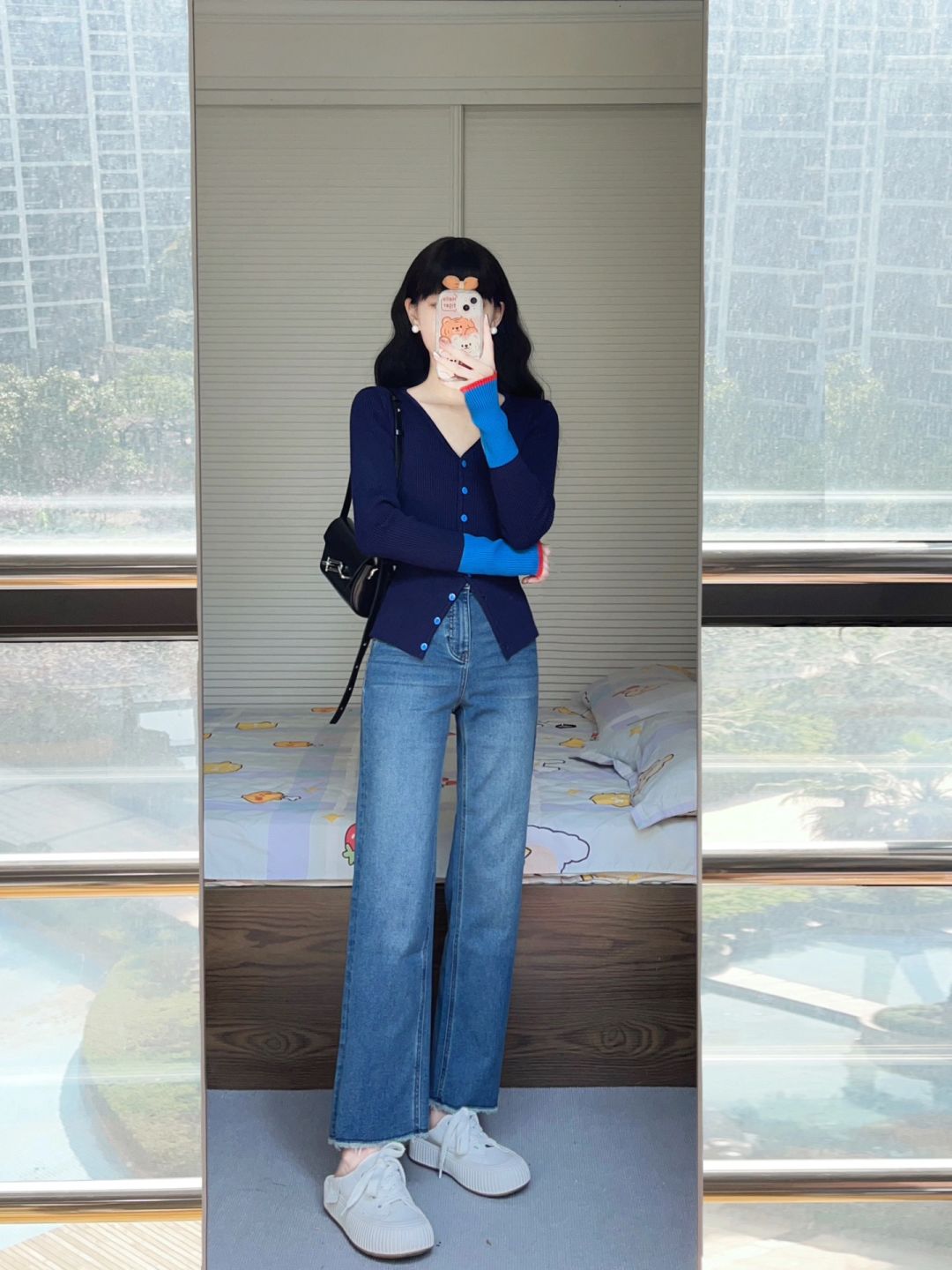 블루 V 넥 대비 컬러 스티칭 긴팔 니트 카디건 코트 여성용 가을 짧은 슬림 핏 언더 셔츠 탑스토어 가기