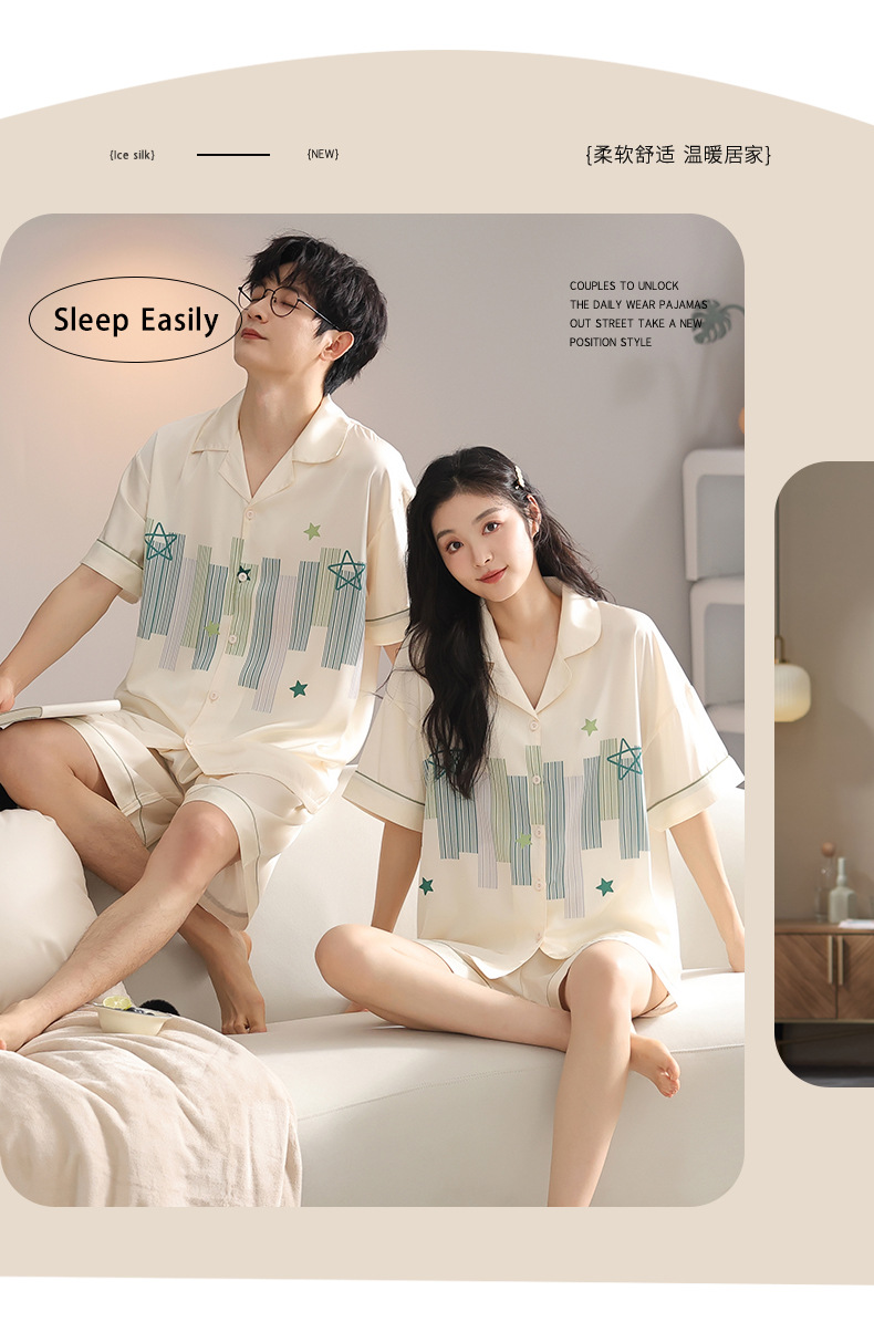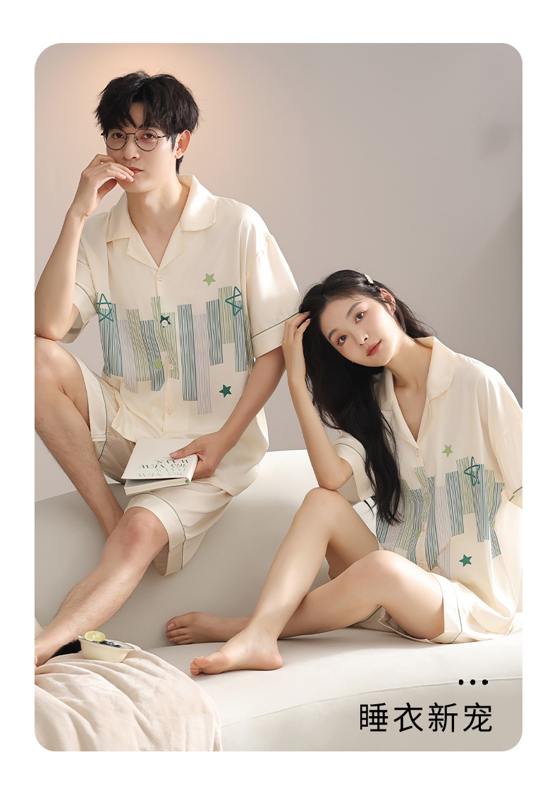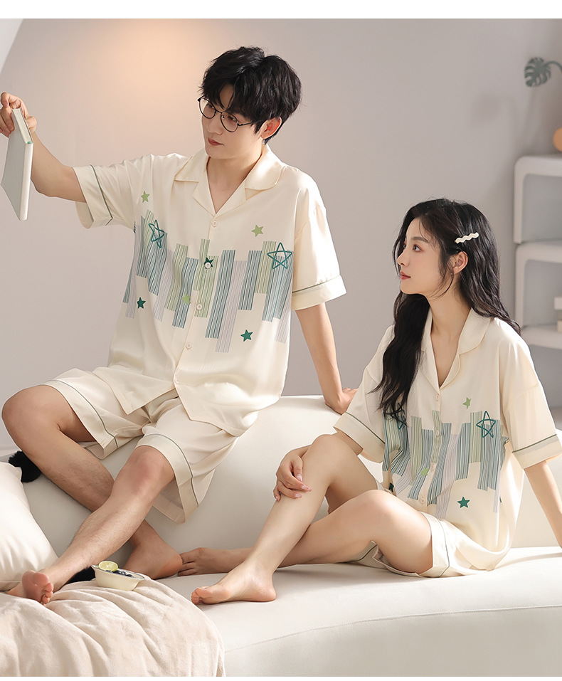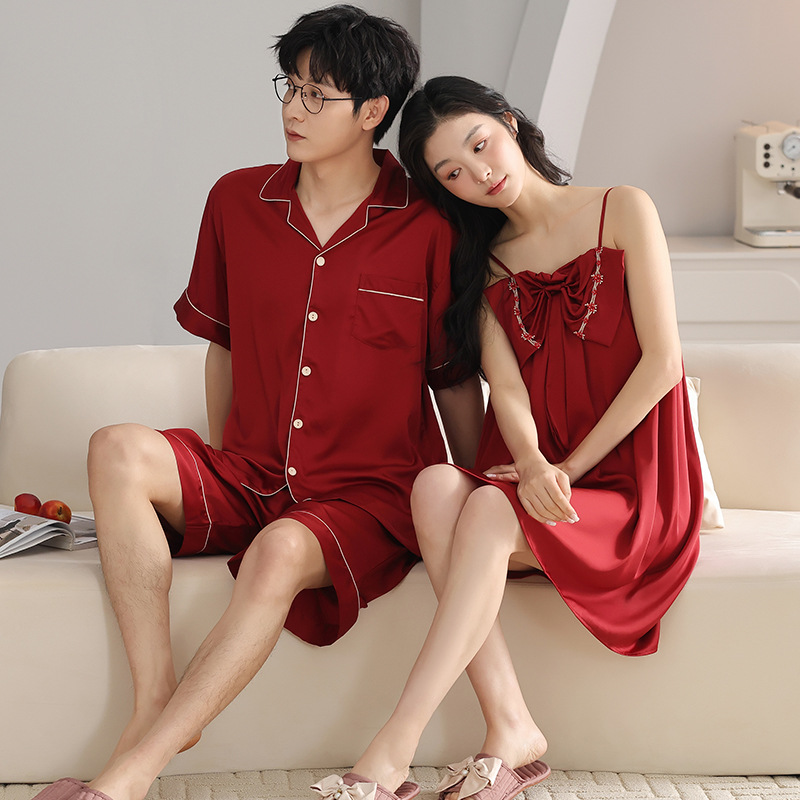 품질 커플 잠옷 여름 인공 실크 남성 실크 아이스 실크 짧은 소매 여성 홈 착용 가슴 패드 세트
