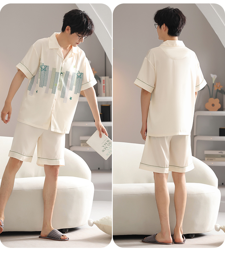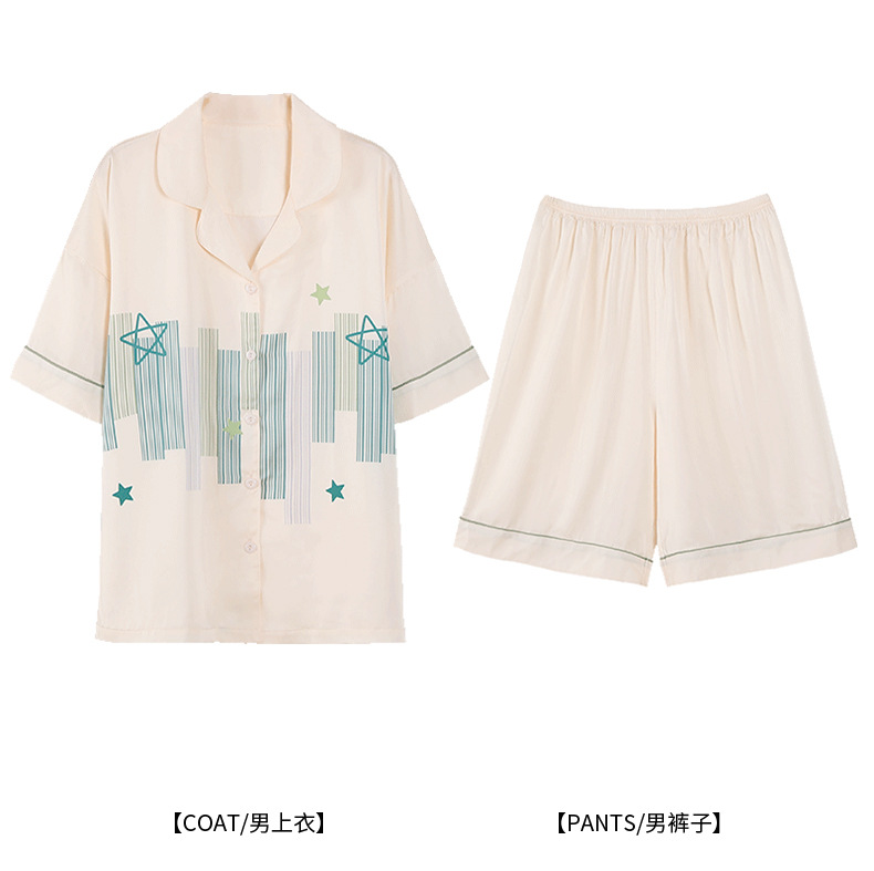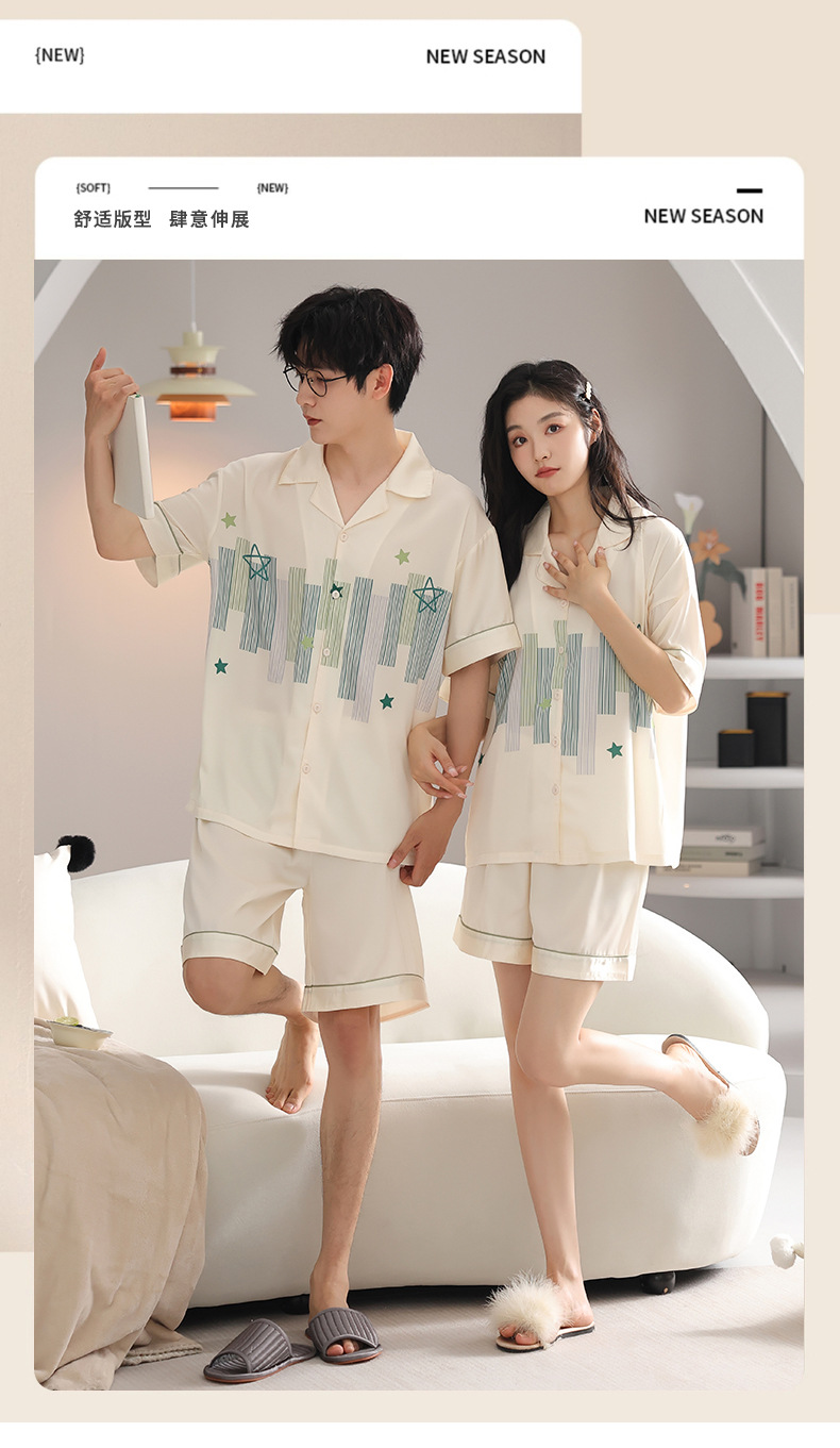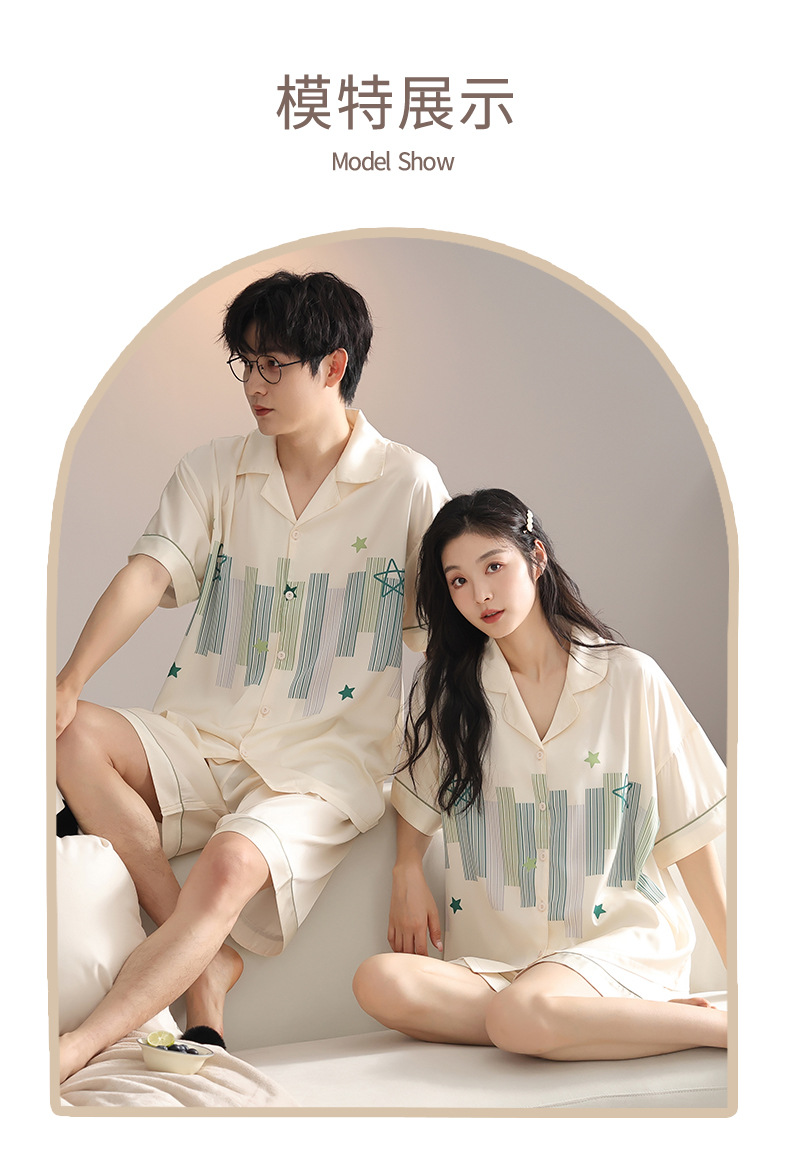 품질 커플 잠옷 여름 인공 실크 남성 실크 아이스 실크 짧은 소매 여성 홈 착용 가슴 패드 세트