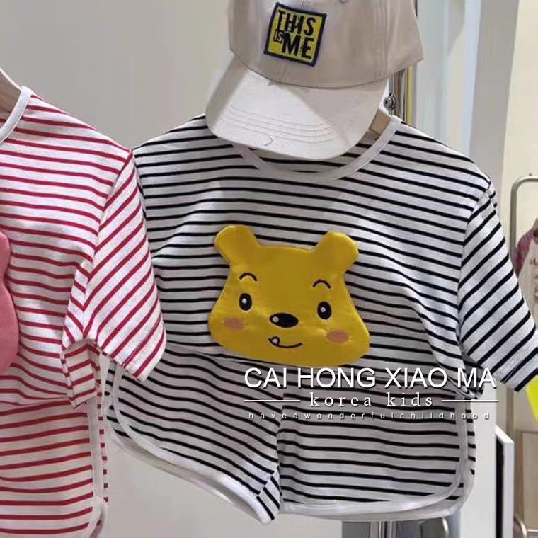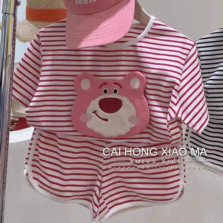 새로운 한국식 어린이 세트 아동복 여름 아기 소녀의 귀여운 캐주얼 줄무늬 소녀 티셔츠 반바지 t 투피스 세트스토어 가기