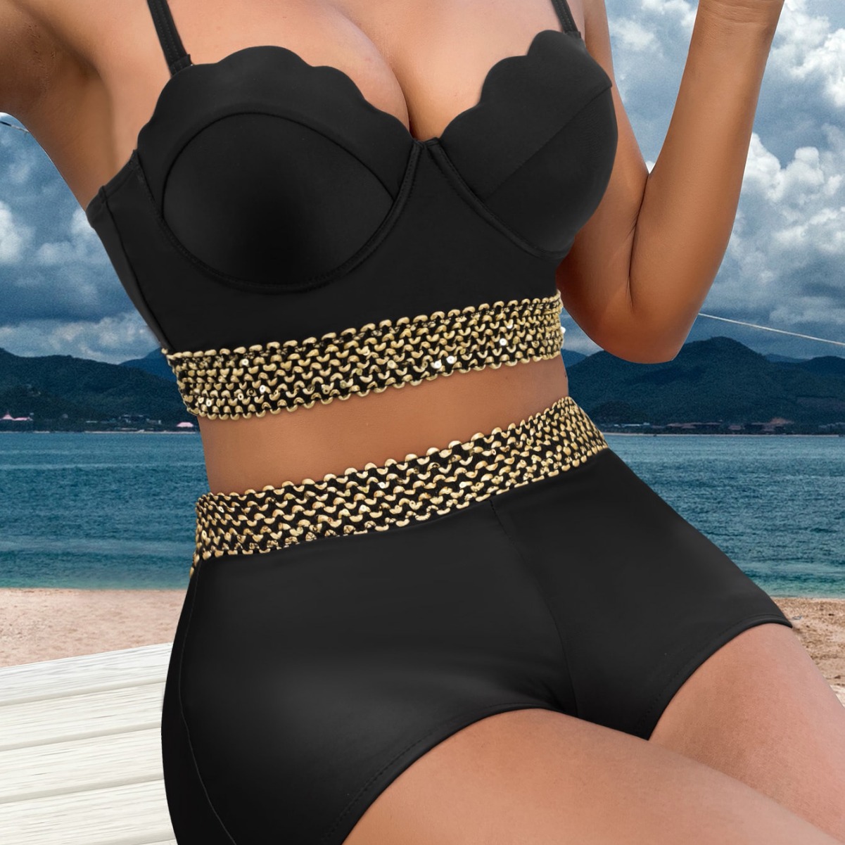 섹시한 3 점 수영복 스타일 스트랩 스티칭 컬러 매칭 하이 허리 복서 반바지 패션 아마존 폭발 국경 특수 수영복