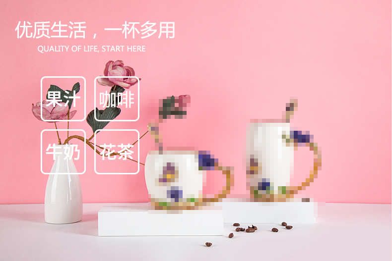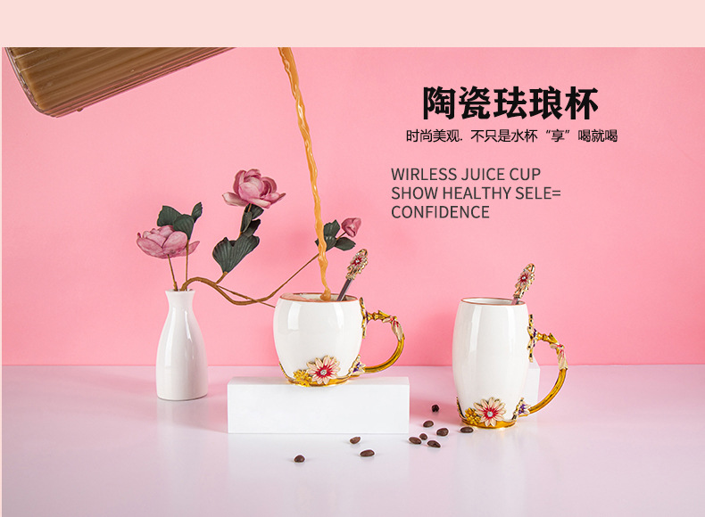 손으로 그린 세라믹 마크 페어 컵 로즈 에나멜 컵 아침 식사 컵 오트밀 향기 차 컵 숟가락 결혼 선물스토어 가기