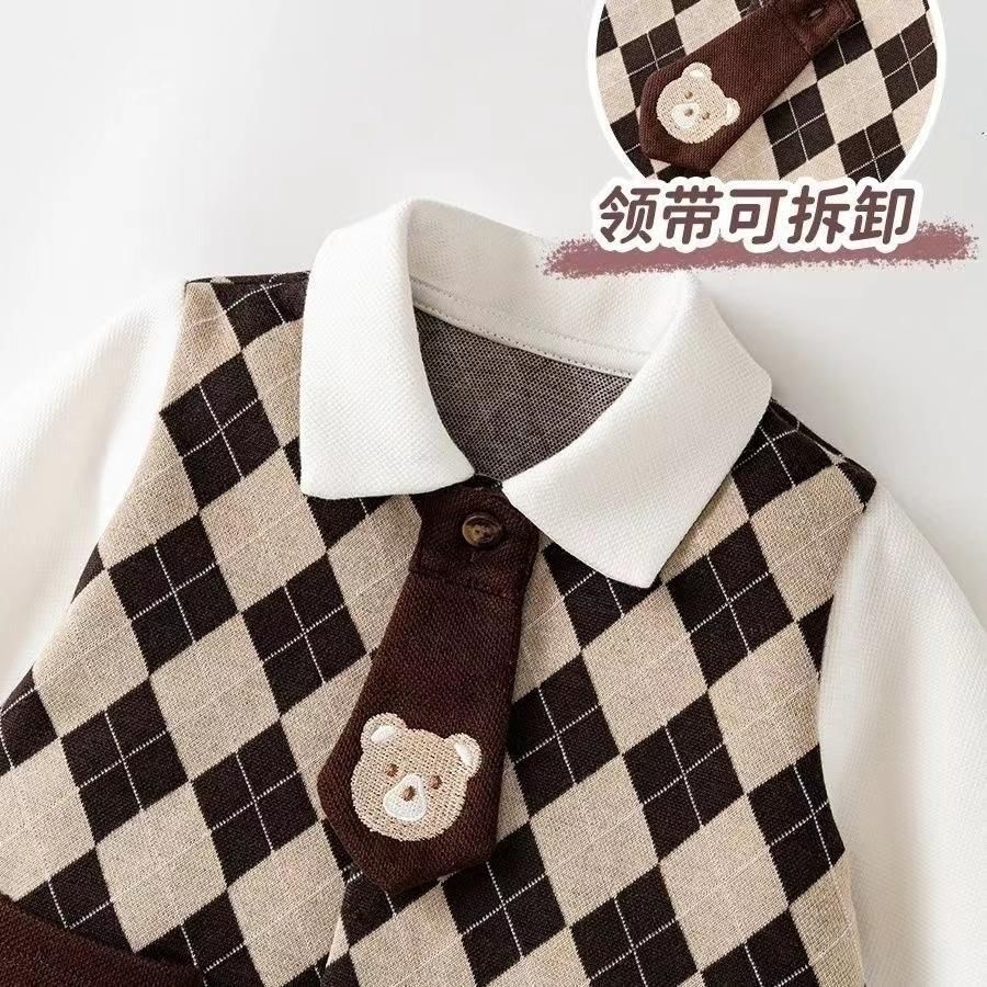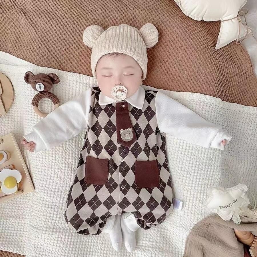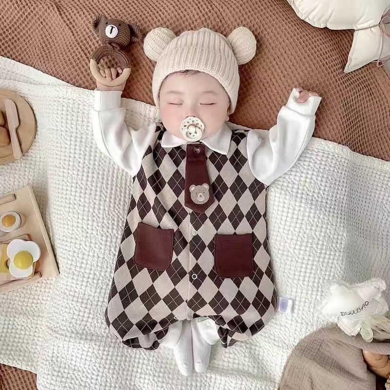 아기 점프 수트 새로운 봄과 가을 슈퍼 귀여운 서양 스타일 롬퍼 신생아 아기 대학 스타일 나들이 롬퍼