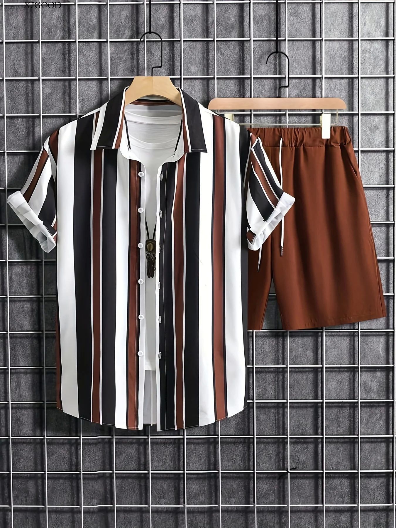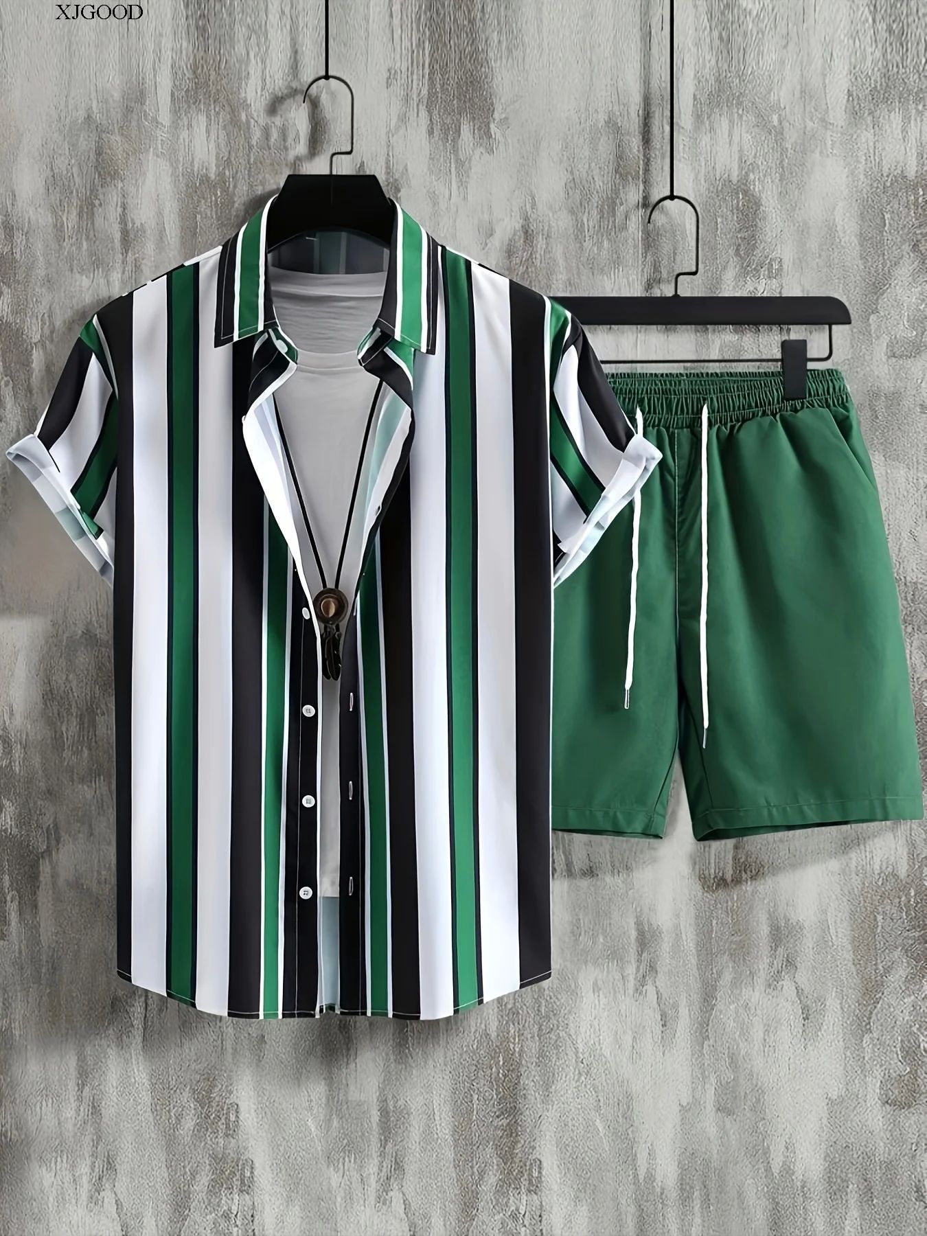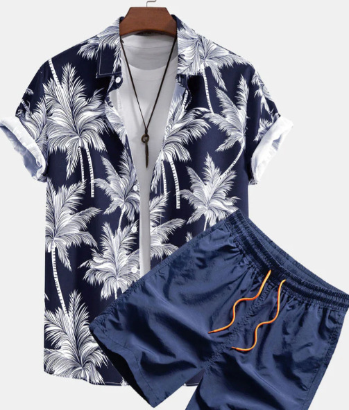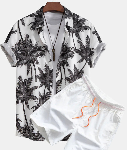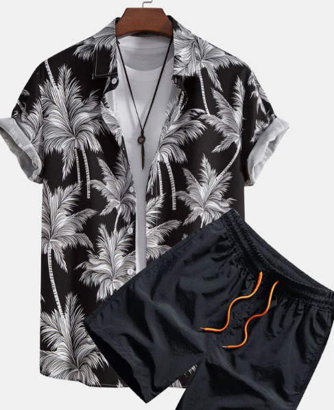 2024 유럽 및 미국 여름 스트리트 패션 흑백 스트라이프 하와이안 비치 남성 셔츠 세트 유럽 및 미국 스타일스토어 가기