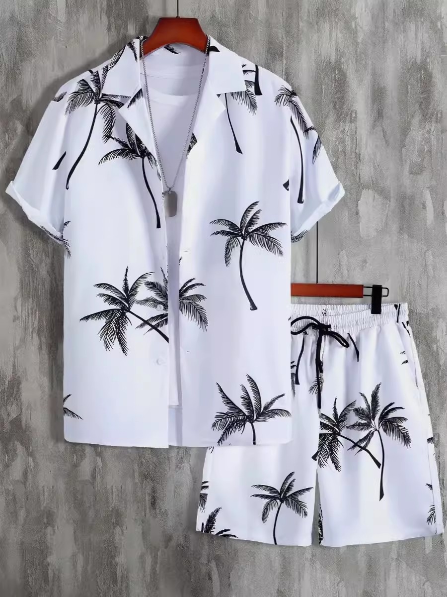 2024 유럽 및 미국 여름 스트리트 패션 흑백 스트라이프 하와이안 비치 남성 셔츠 세트 유럽 및 미국 스타일