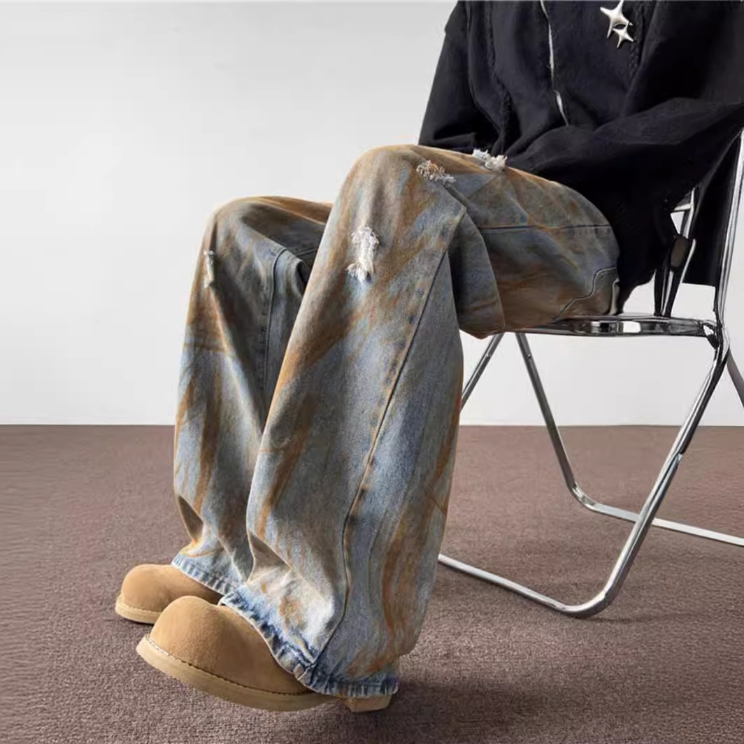 씻은 고민 청바지 남성 2024 봄 미국 하이 스트리트 복고풍 느슨한 드레이핑 폐기물 토양 바람 걸레 바지스토어 가기