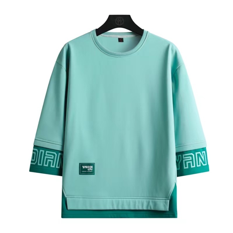 대외 무역 남자 긴팔 둥근 목 티셔츠 한국 스타일 컬러 매칭 가짜 투피스 단색 3/4 소매 가을 뉴 플러스 사이즈 남성 의류