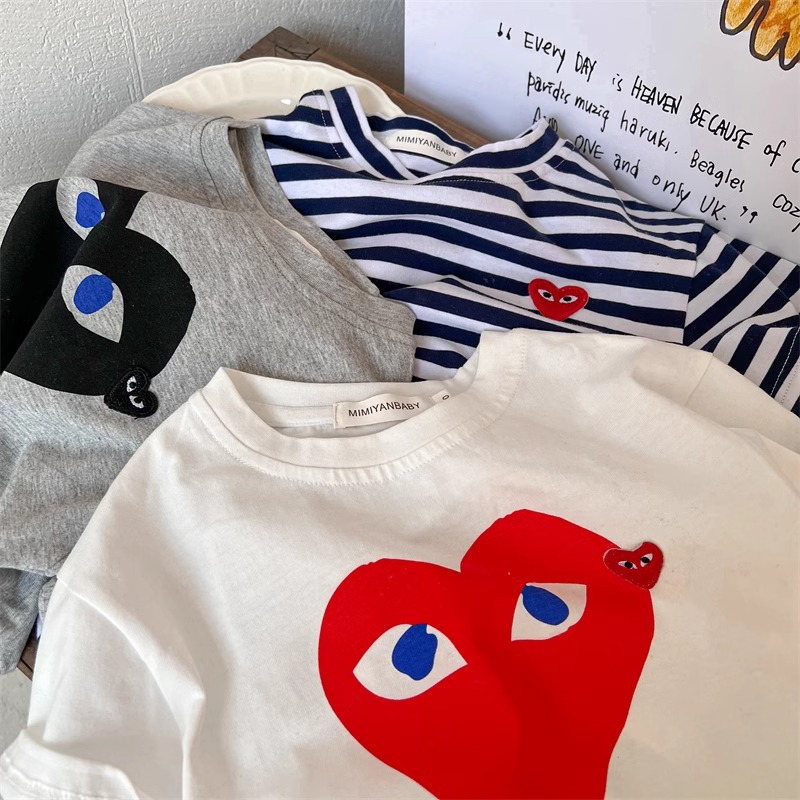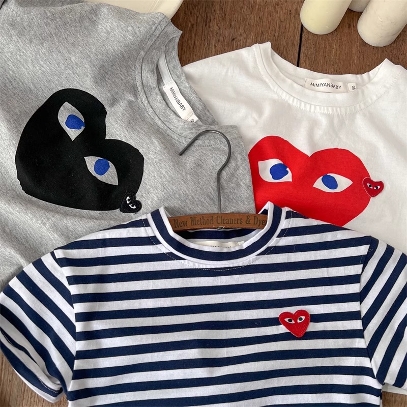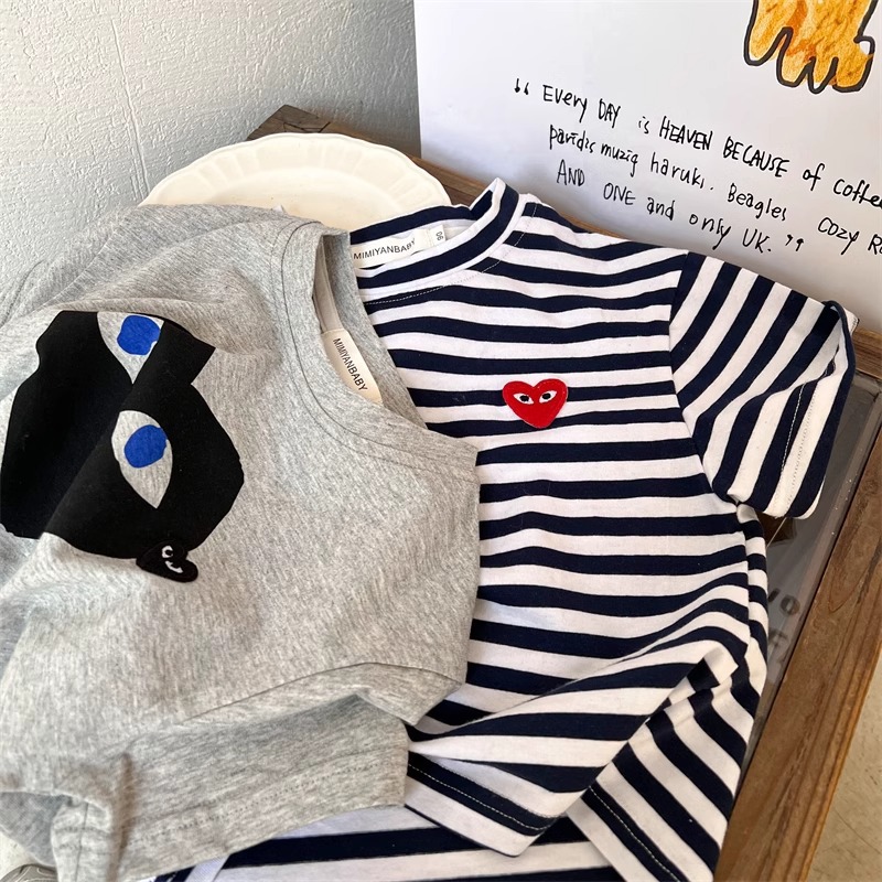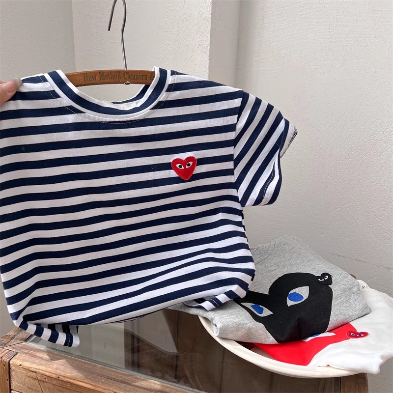 어린이 티셔츠 반팔 여름 소년 2024 새로운 탑 사랑 T 패션 브랜드 아기 줄무늬 반팔 셔츠 여성용스토어 가기