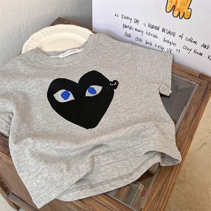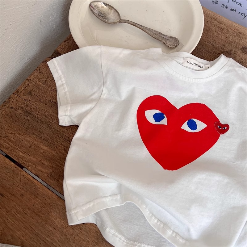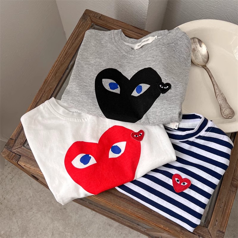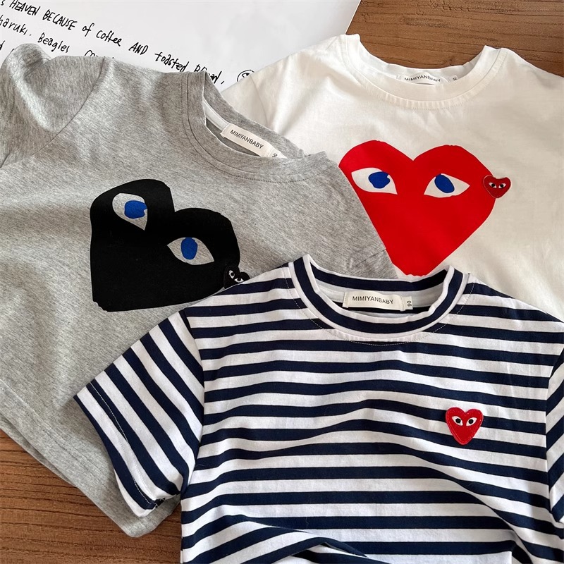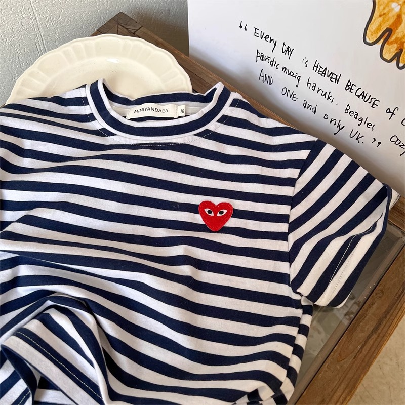 어린이 티셔츠 반팔 여름 소년 2024 새로운 탑 사랑 T 패션 브랜드 아기 줄무늬 반팔 셔츠 여성용