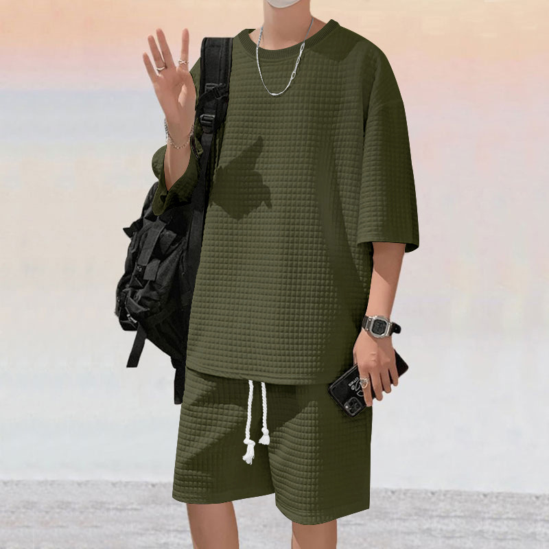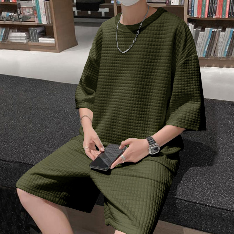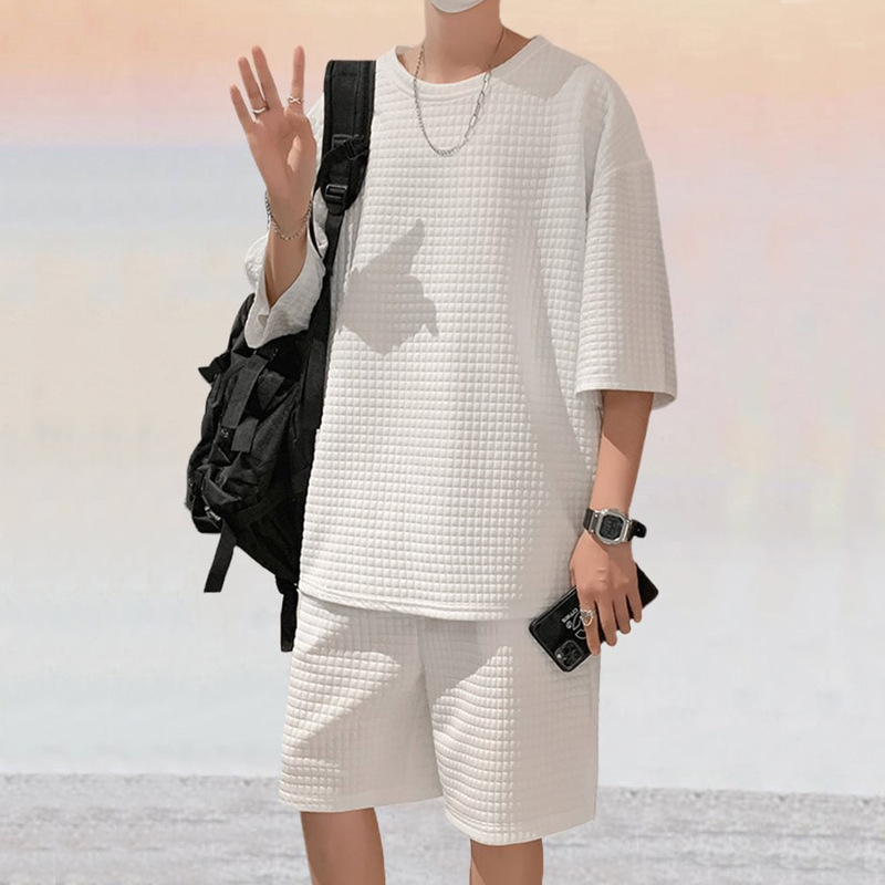 국경 간 작은 격자 무늬 스포츠 캐주얼 남성 반팔 티셔츠 여름 무거운 오버 사이즈 느슨한 반팔 반바지 세트스토어 가기
