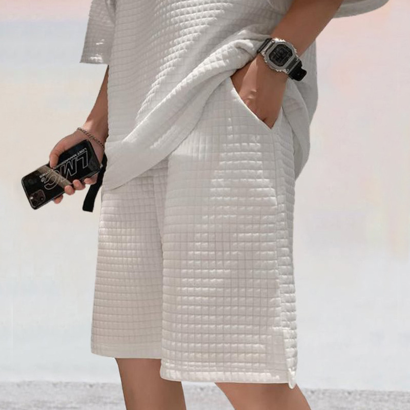 국경 간 작은 격자 무늬 스포츠 캐주얼 남성 반팔 티셔츠 여름 무거운 오버 사이즈 느슨한 반팔 반바지 세트