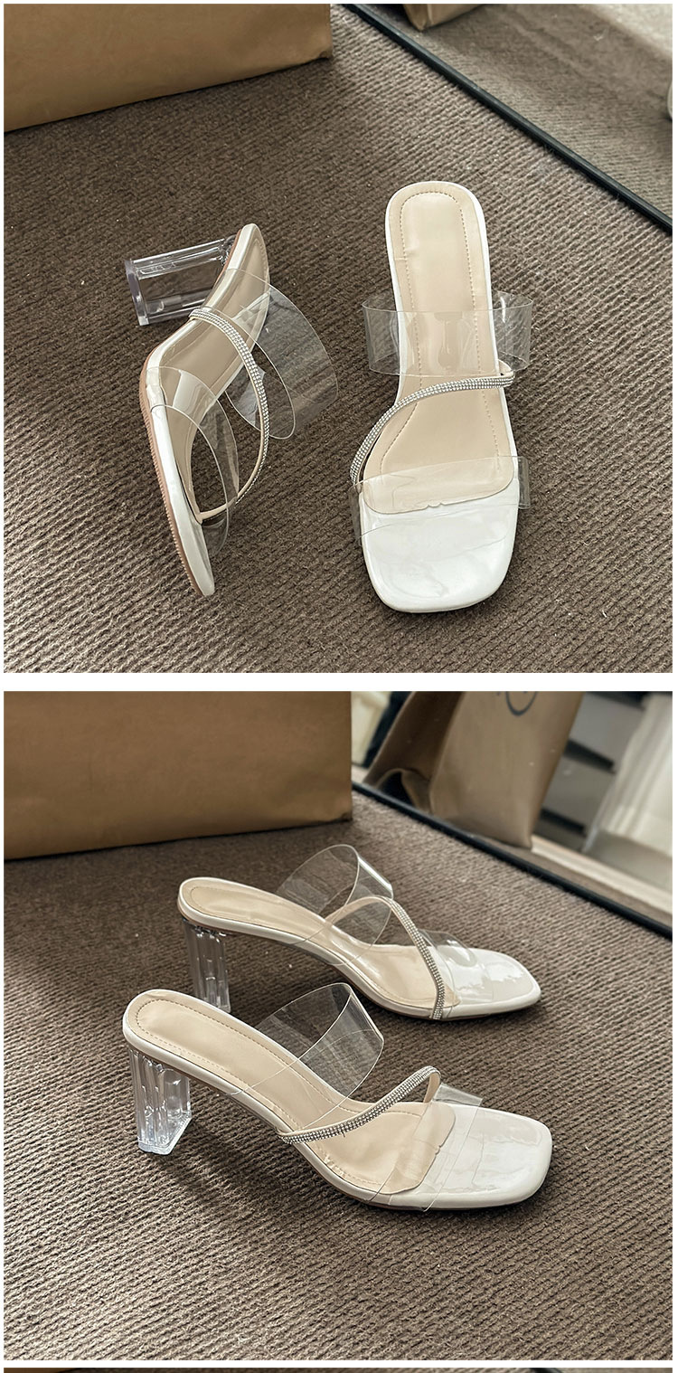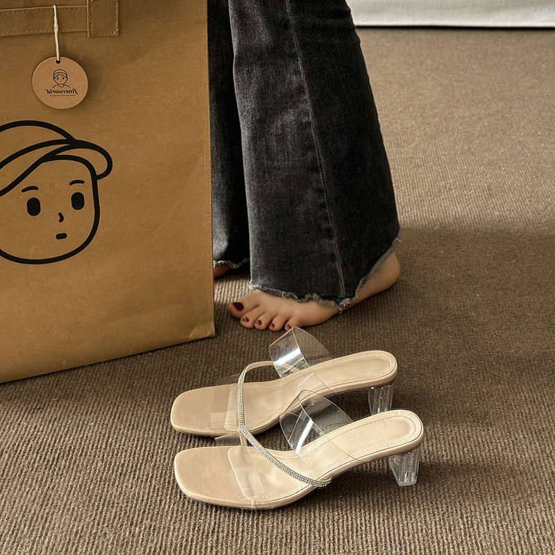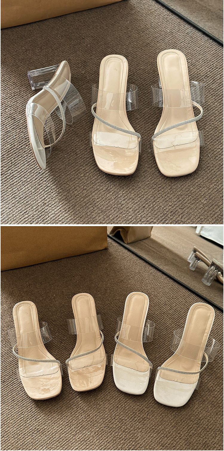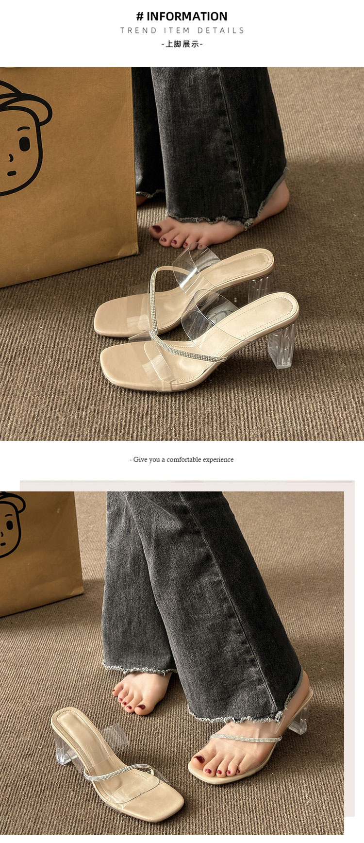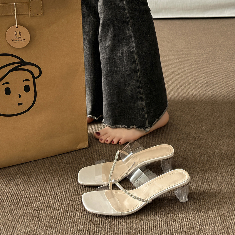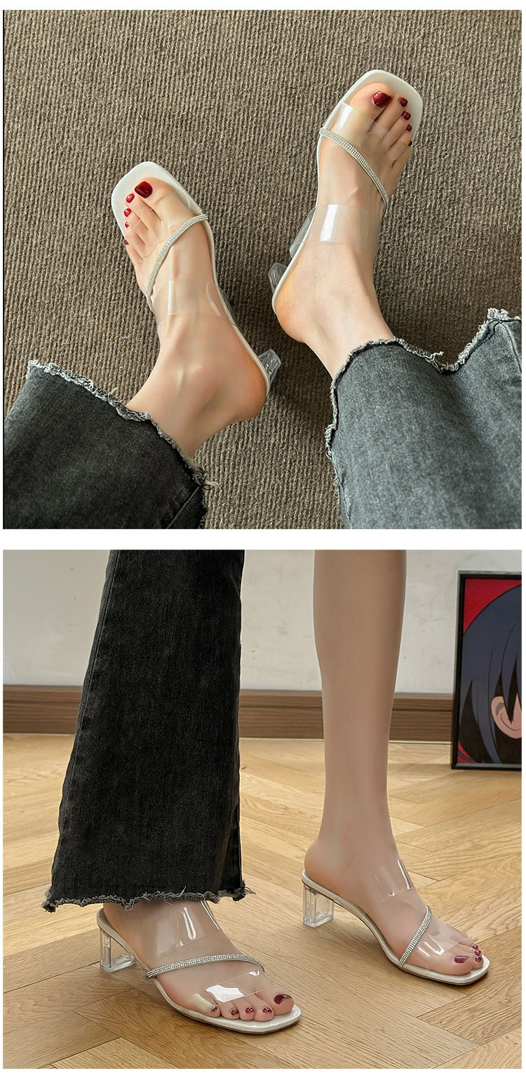 원스트랩 하이힐 슬리퍼 2024 여름 새로운 투명 방수 플랫폼 크리스탈 청키 힐 미드 힐 샌들 여성 요정 스타일