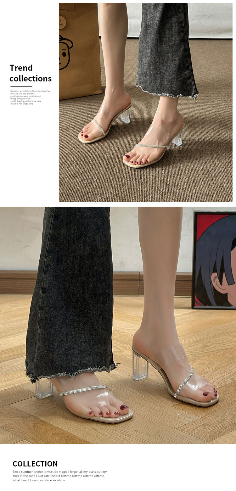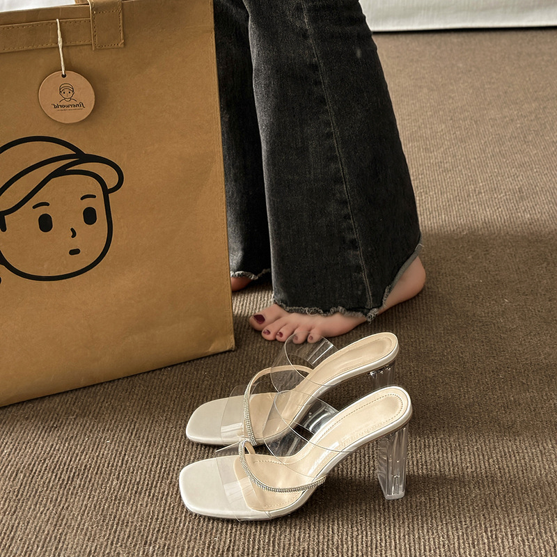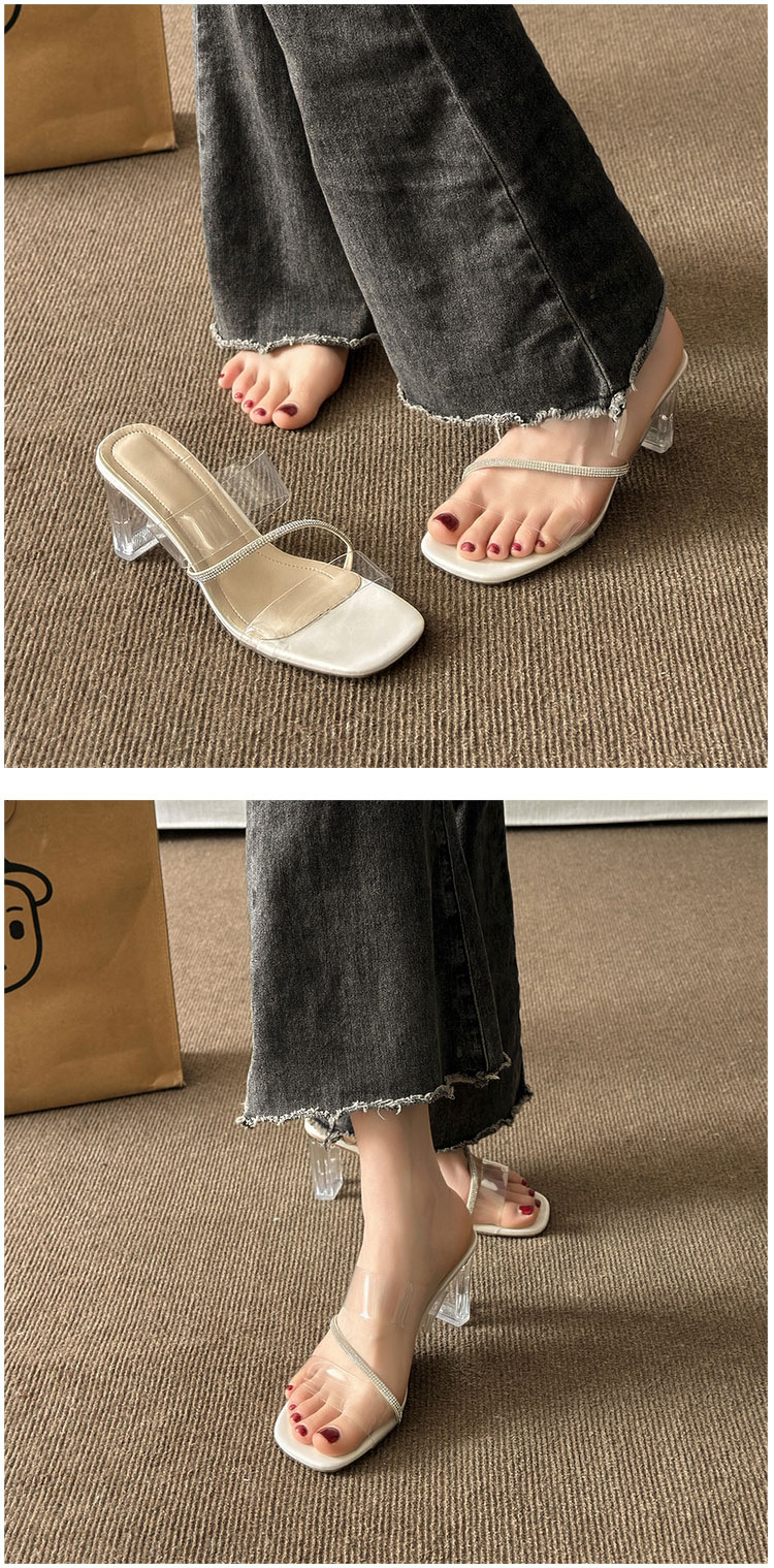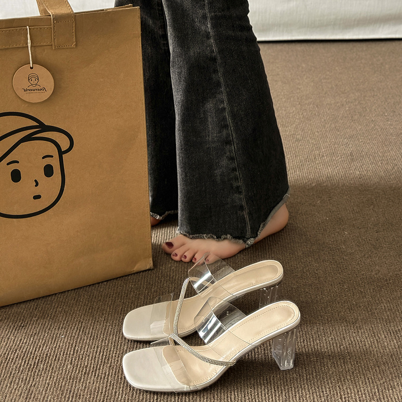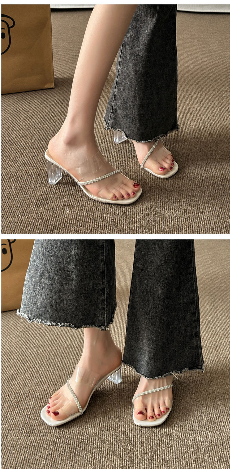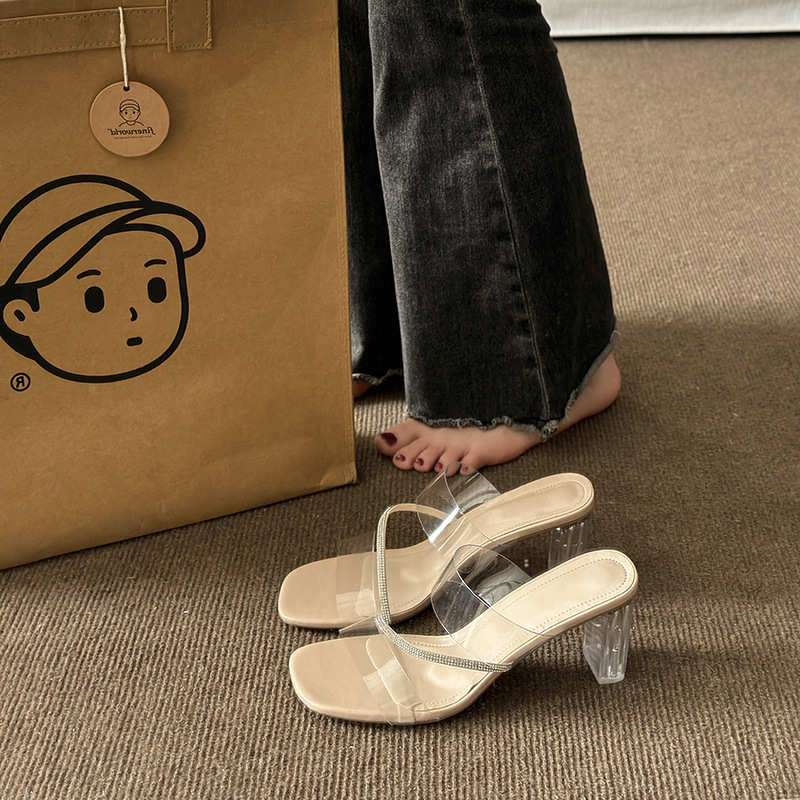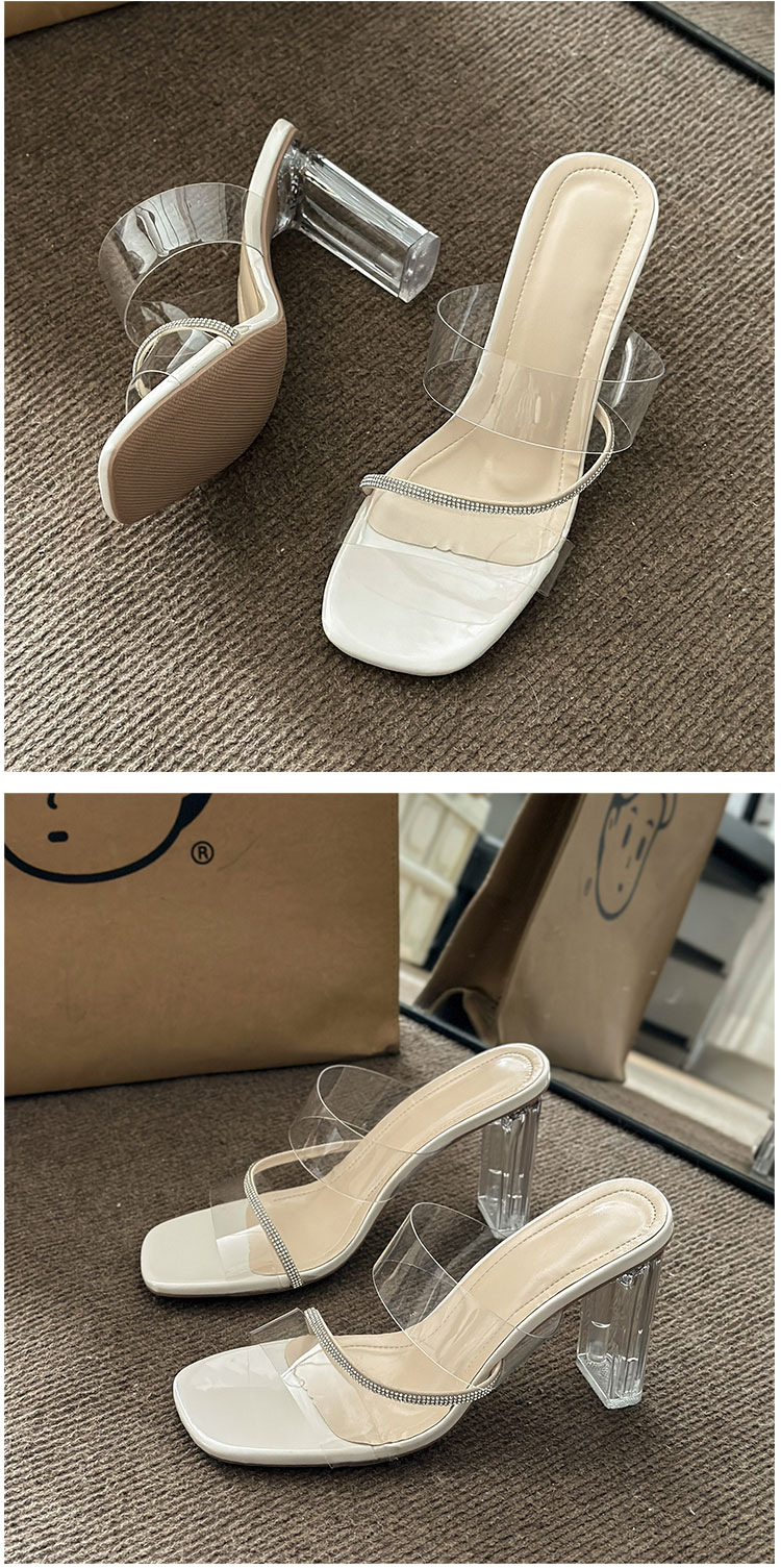 원스트랩 하이힐 슬리퍼 2024 여름 새로운 투명 방수 플랫폼 크리스탈 청키 힐 미드 힐 샌들 여성 요정 스타일