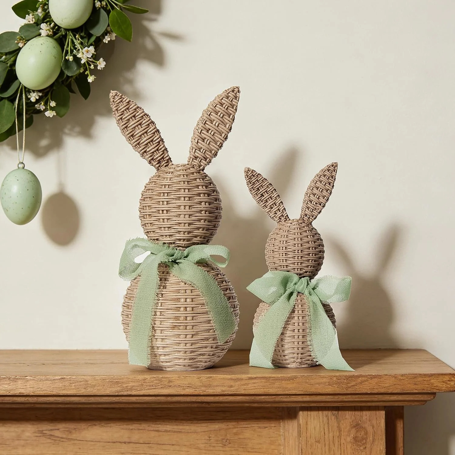 2피스 세트 인조 등나무 부활절 토끼 장식품, 등나무 질감의 플라스틱 토끼 조각상, 농가 스타일 테이블 장식