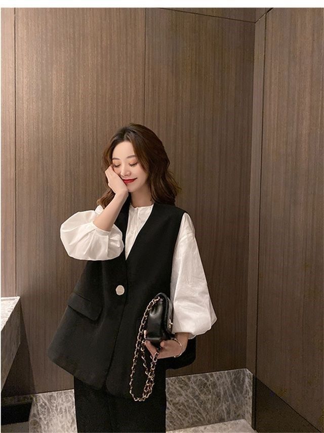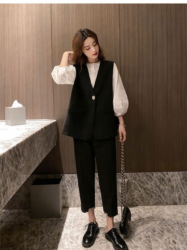 플러스 사이즈 패션 세트 여성의 가을 옷 통통녀 세트 조끼 셔츠 바지 서양식 3 피스 세트스토어 가기