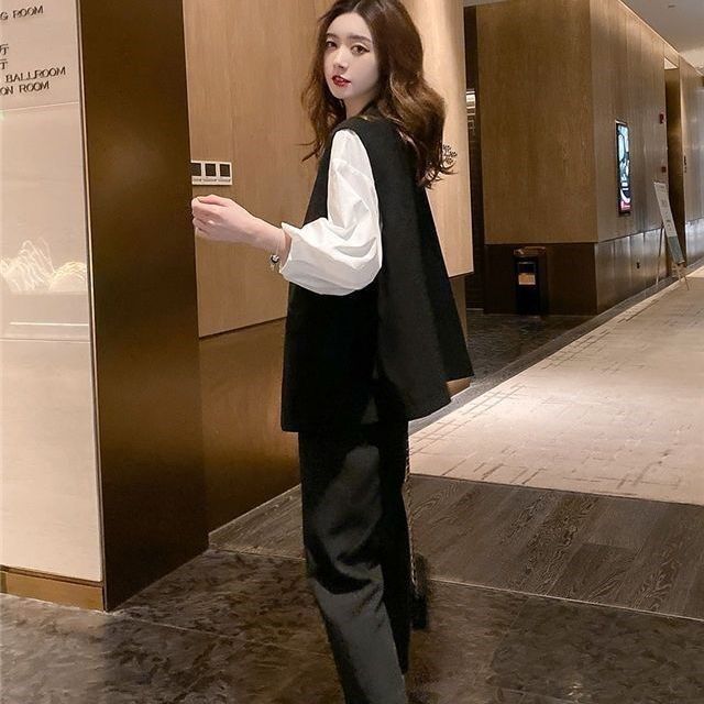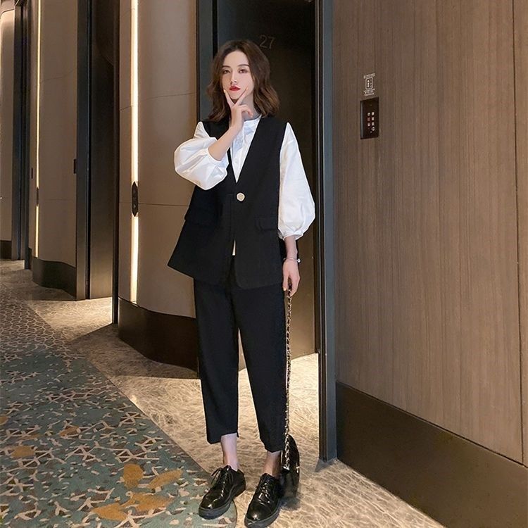플러스 사이즈 패션 세트 여성의 가을 옷 통통녀 세트 조끼 셔츠 바지 서양식 3 피스 세트