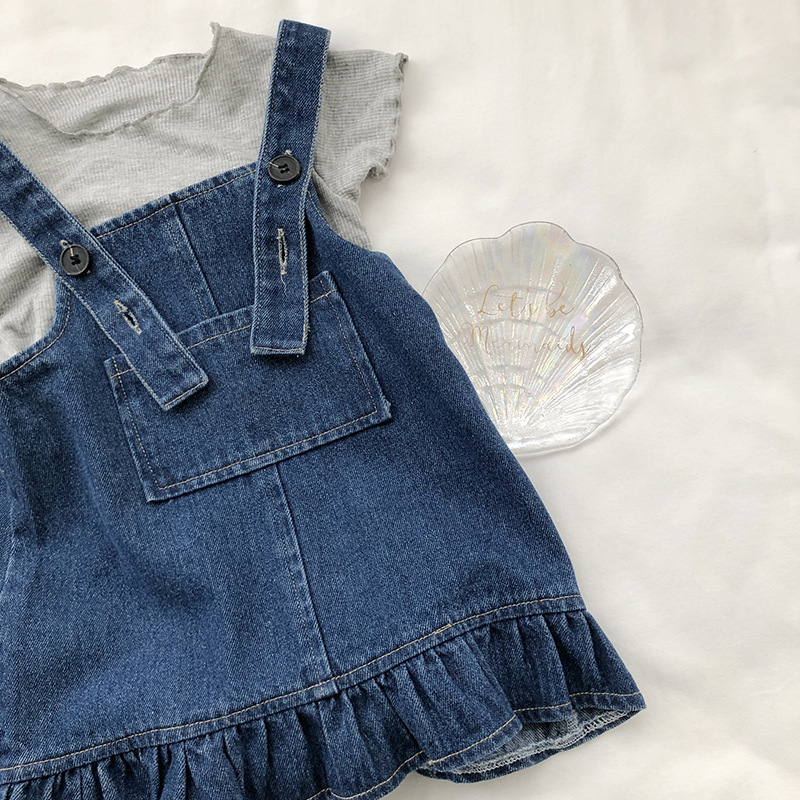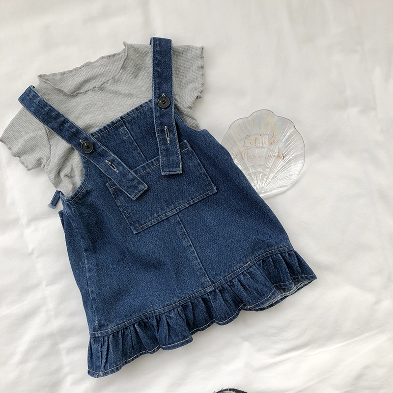 소녀 세트 2024 여름 어린이 한국식 데님 서스펜더 스커트 회색 나무 귀 바닥 셔츠 투피스 세트스토어 가기