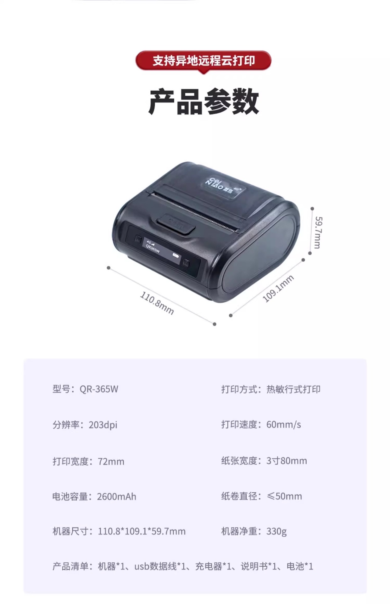 Qirui QR365W 익스프레스 100 Cainiao 4G 클라우드 프린터 휴대용 얼굴 단일 독립형 전자 상거래 바코드 프린터