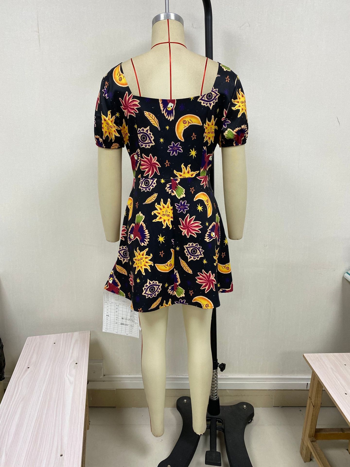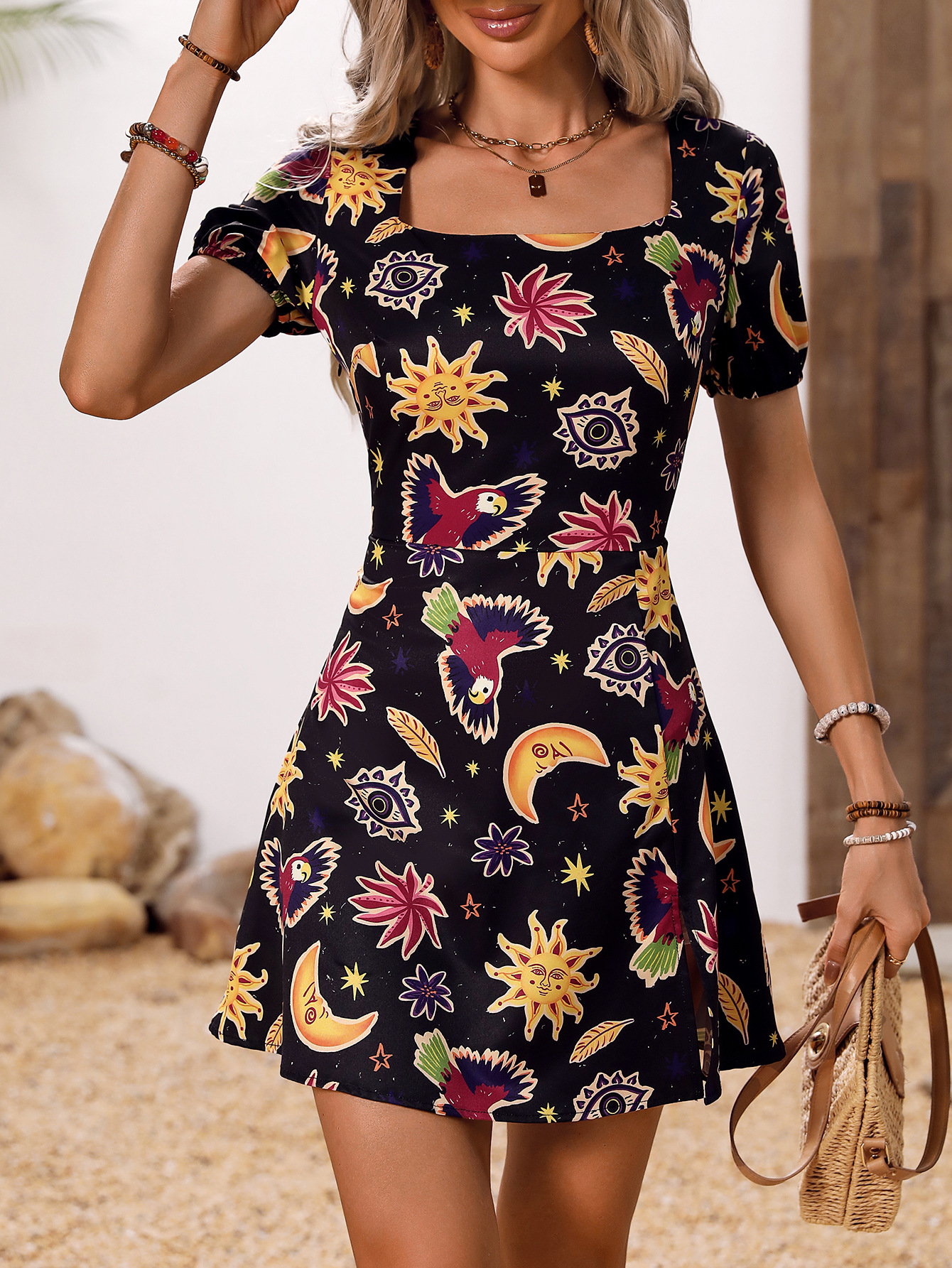 여성 열대 스타일 고딕 특징적인 신비한 요소 인쇄 A 라인 버전 사이드 슬릿 퍼프 소매 원피스