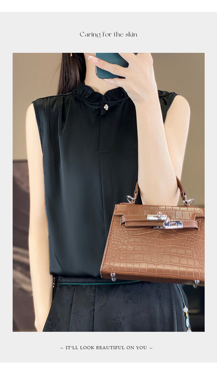 실크 새틴 2025 봄 여름 여성 신상 새틴 러플 라운드넥 히든 버튼 민소매 셔츠 단색 상의스토어 가기