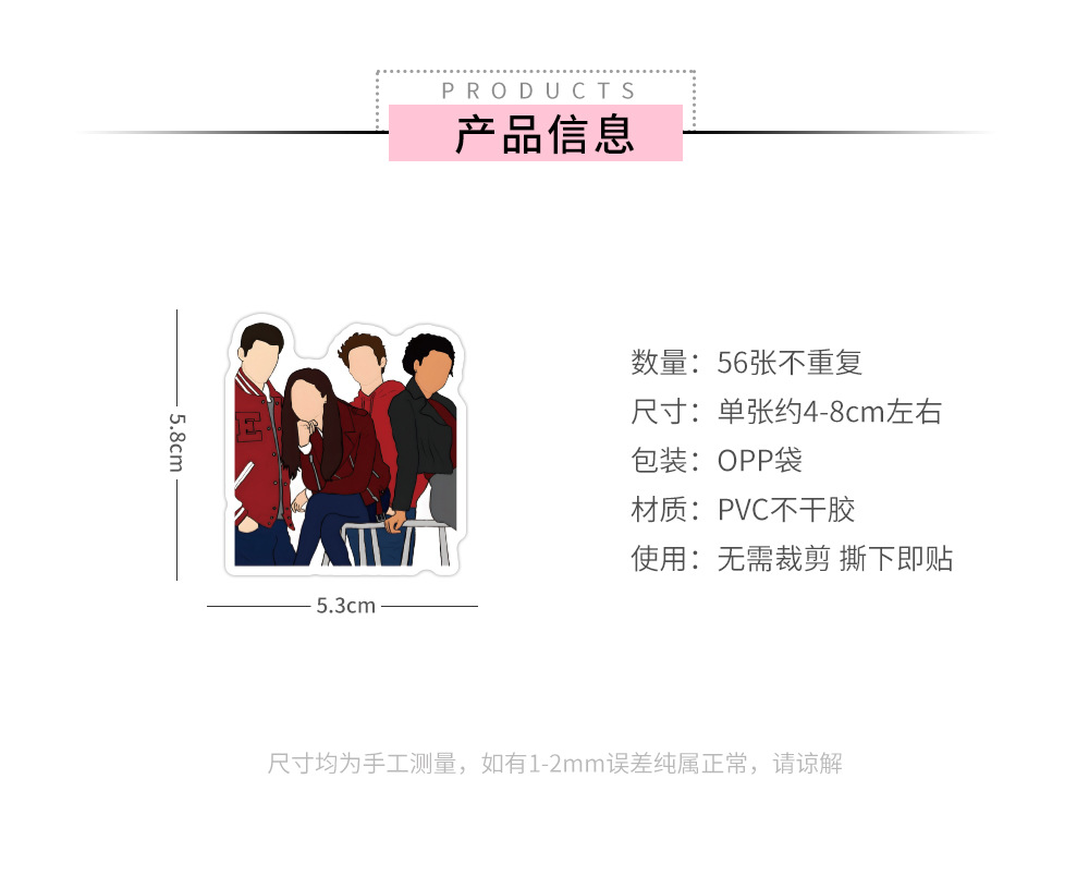 产品采用防水材质,进口海德堡高清印刷、覆膜,贴纸按形状模切完好,不用担心自己裁剪地歪歪扭扭