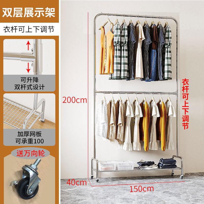 더블 레이어 조정 가능한 행거 바닥 스테인레스 스틸 의류 랙 여성 의류 매장 중다오 선반 바퀴 의류 디스플레이 랙