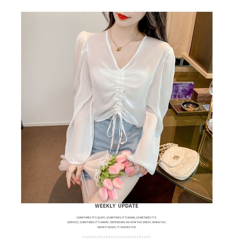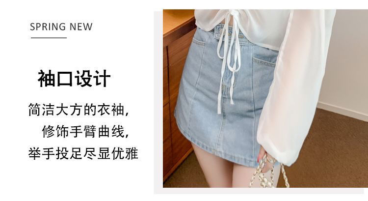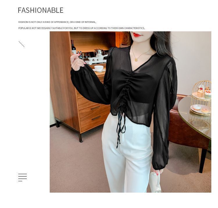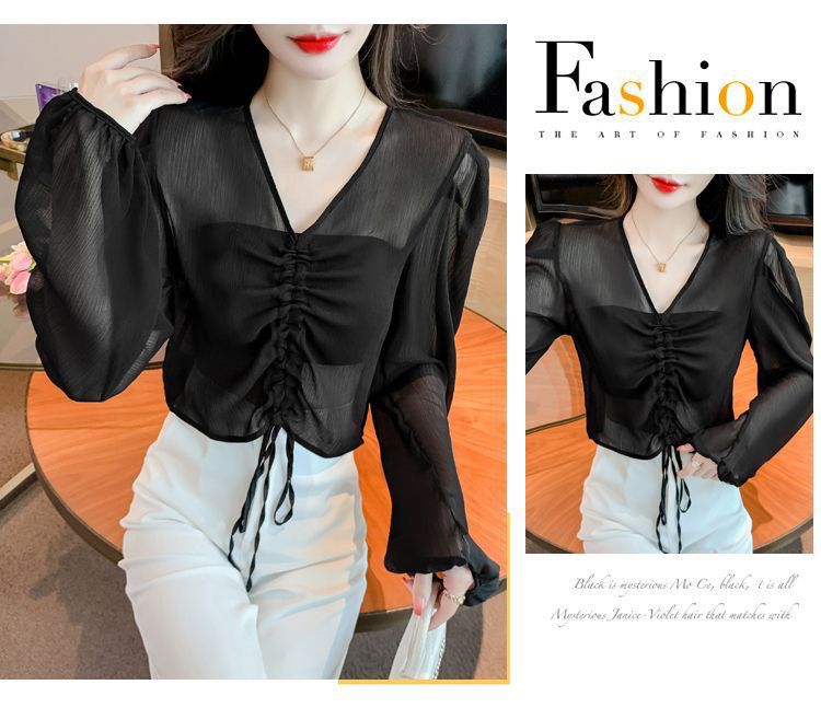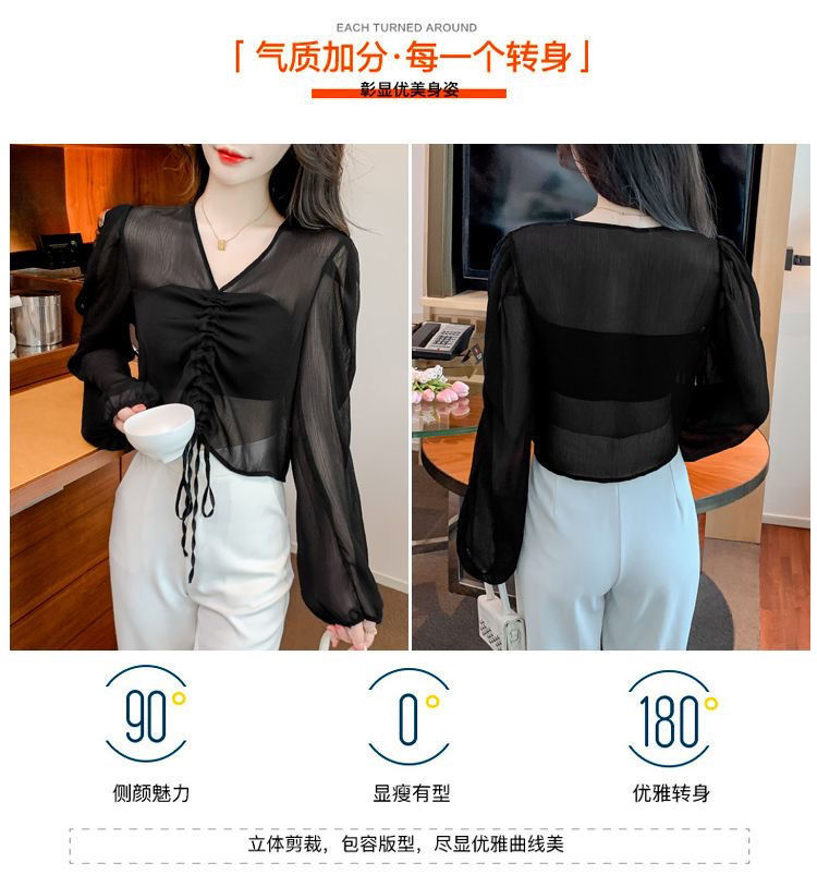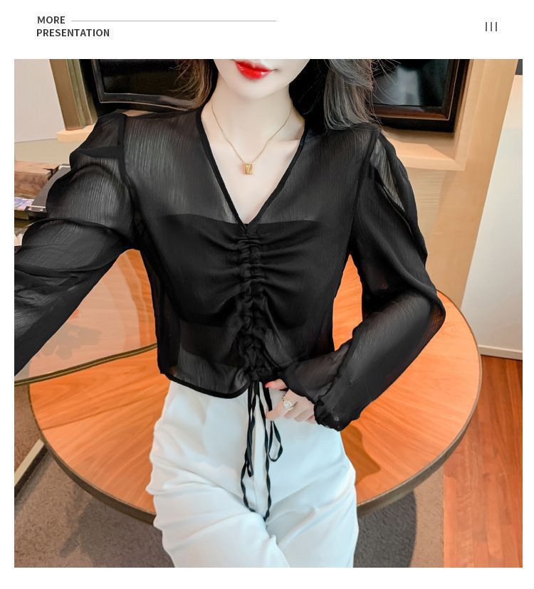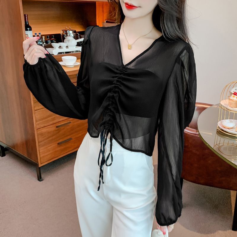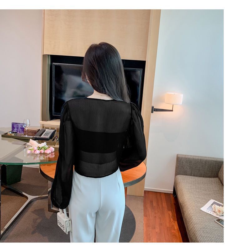 여름 얇은 뜨거운 소녀 최고 달콤한 기질 작은 셔츠 2024 새로운 프랑스 퍼프 소매 상단 짧은 태양 보호 의류스토어 가기