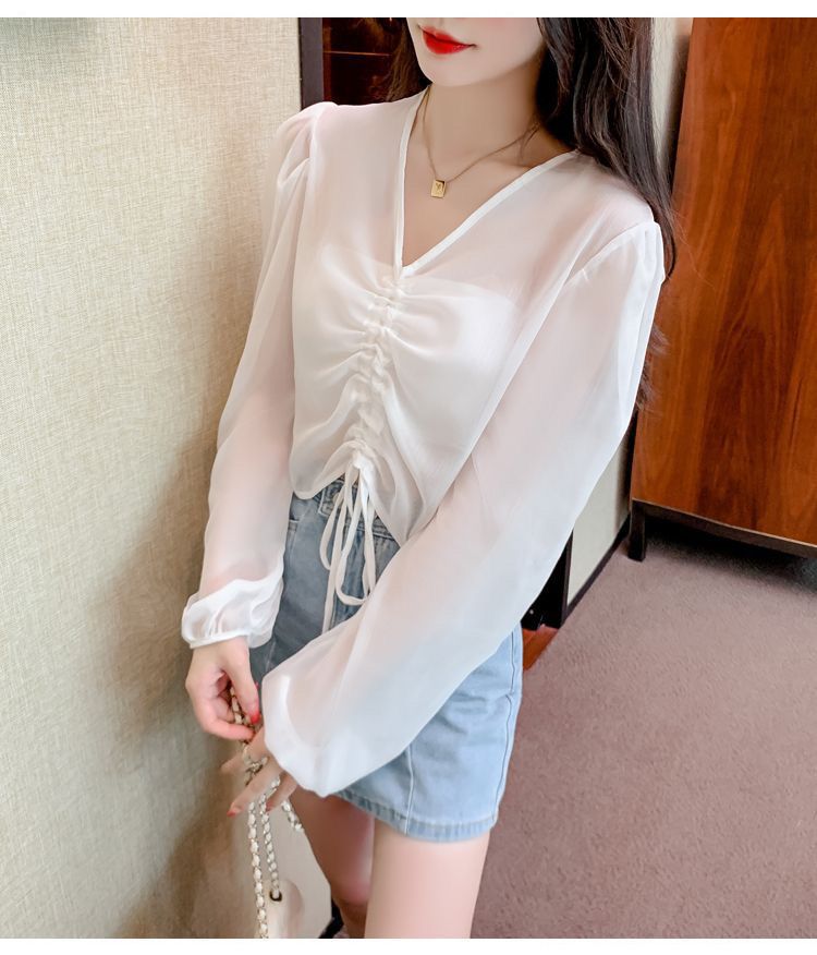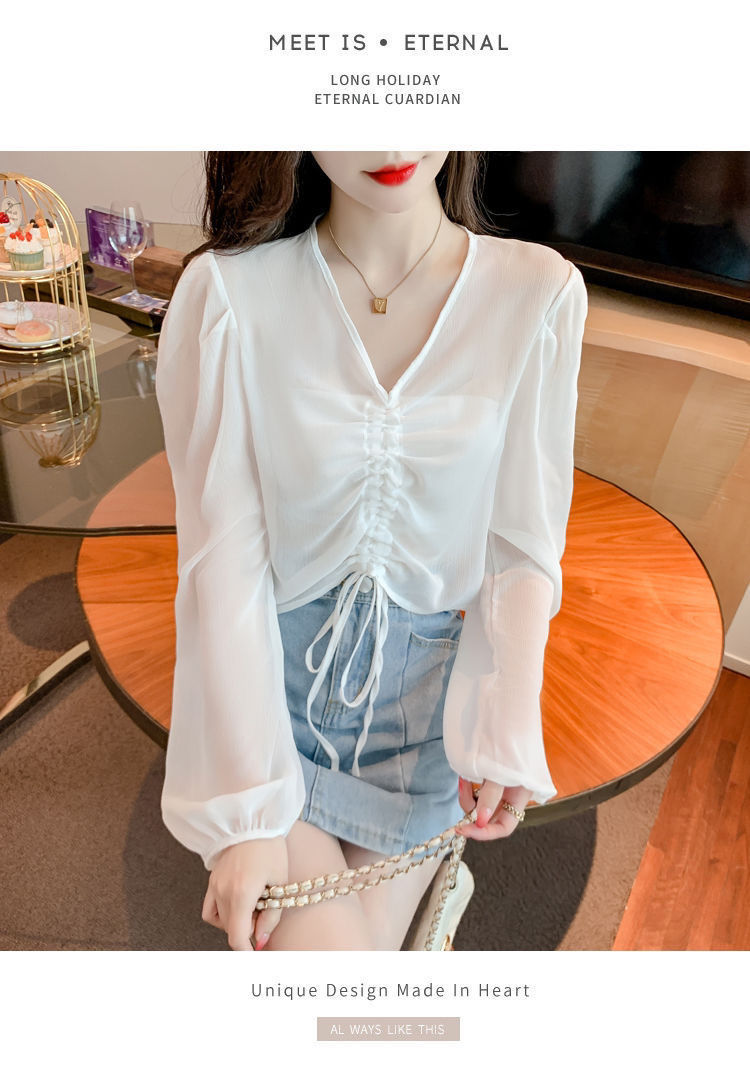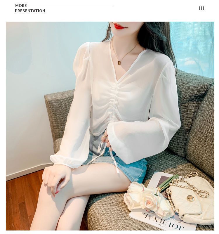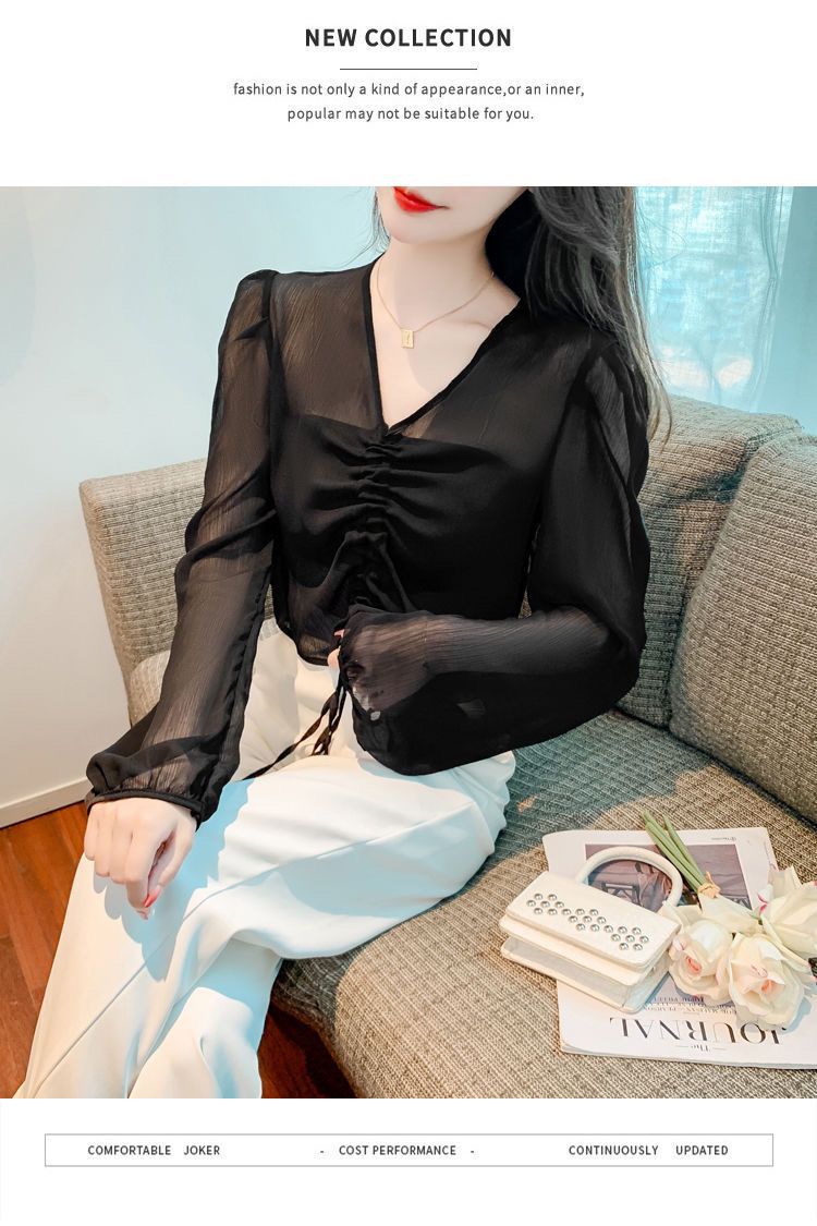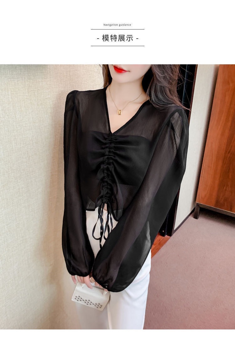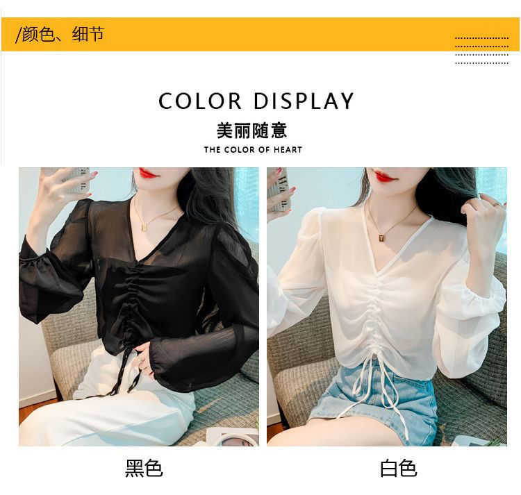 여름 얇은 뜨거운 소녀 최고 달콤한 기질 작은 셔츠 2024 새로운 프랑스 퍼프 소매 상단 짧은 태양 보호 의류스토어 가기
