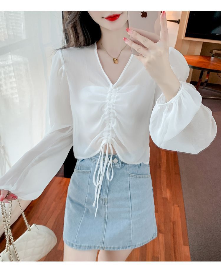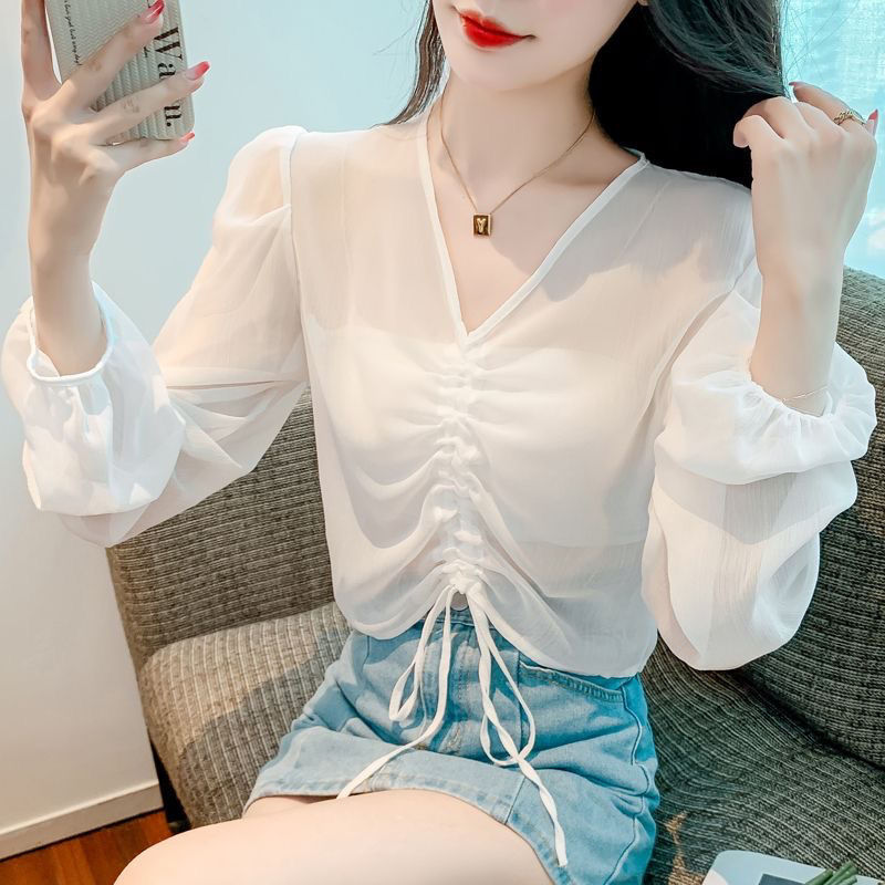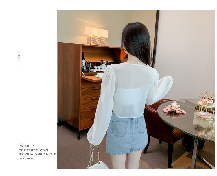 여름 얇은 뜨거운 소녀 최고 달콤한 기질 작은 셔츠 2024 새로운 프랑스 퍼프 소매 상단 짧은 태양 보호 의류