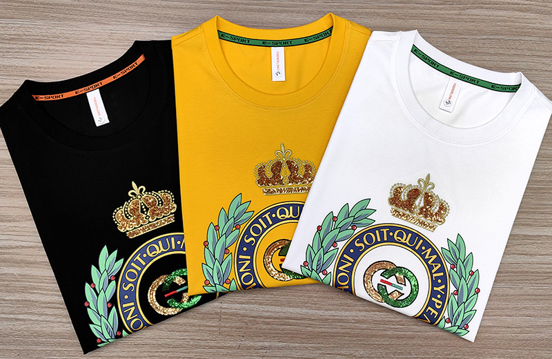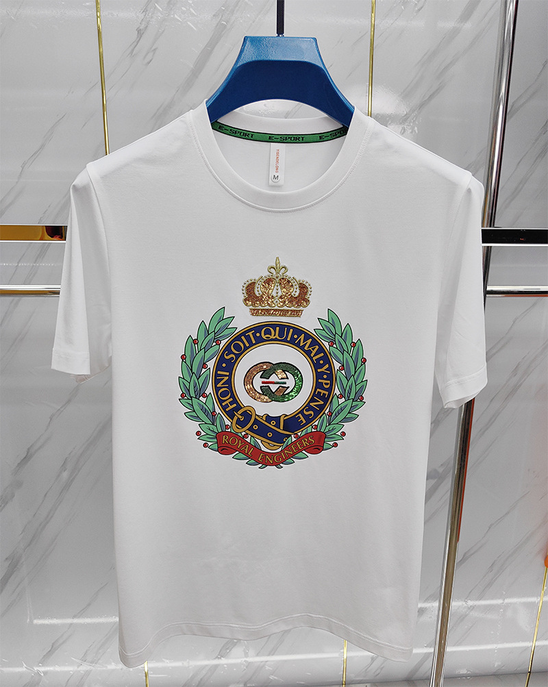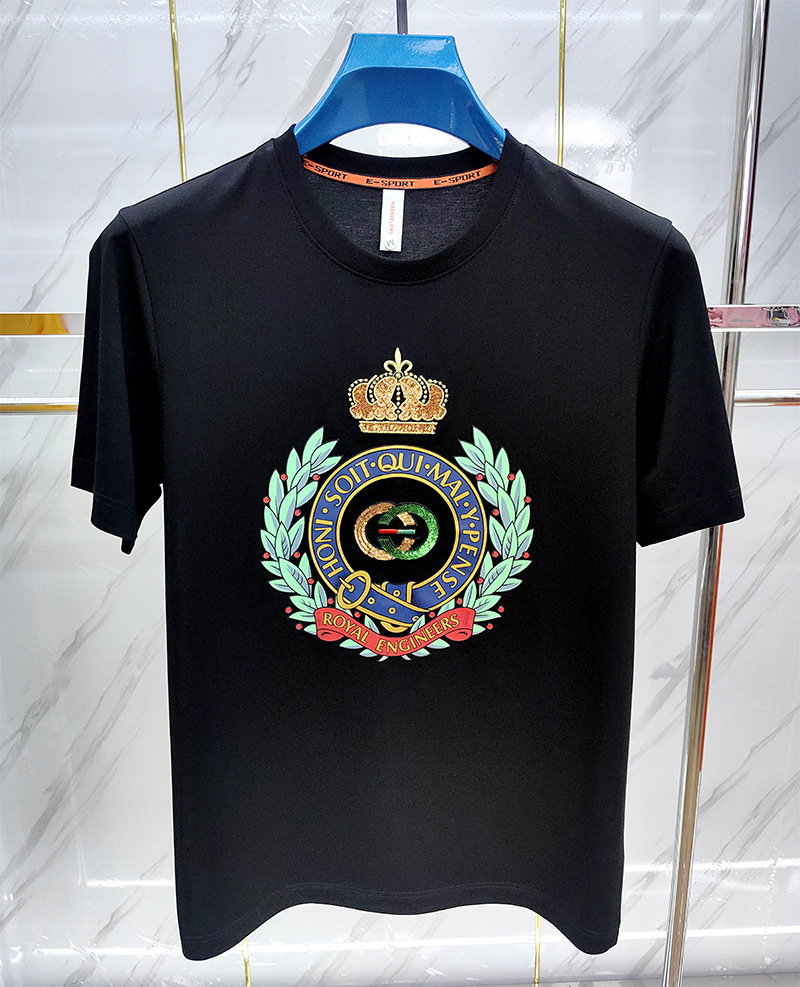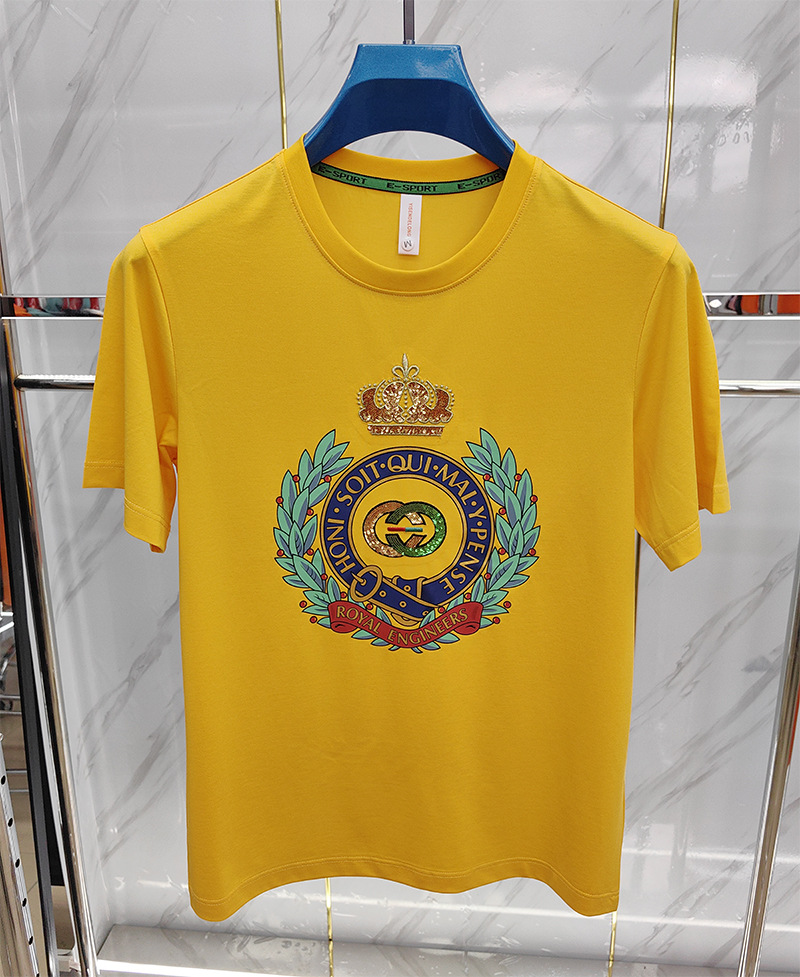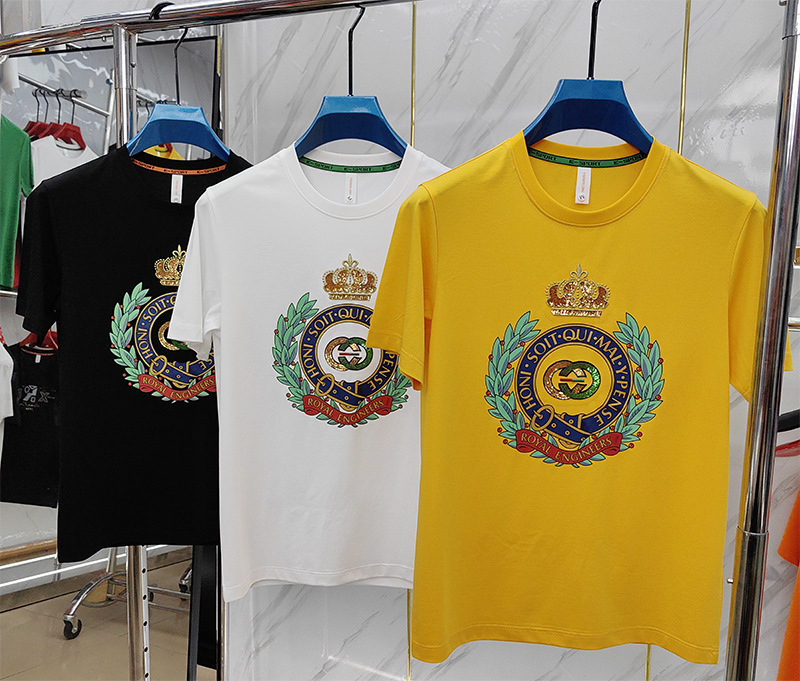 Mercerized 면화 남성용 반팔 티셔츠 2024 세부 정보 새로운 유럽 패션 무거운 자수 청소년 편안한 라운드 칼라 패션스토어 가기