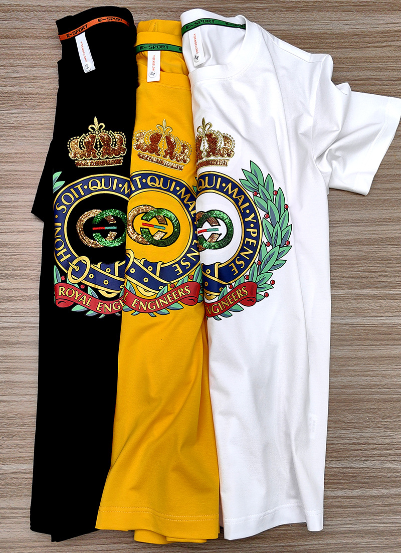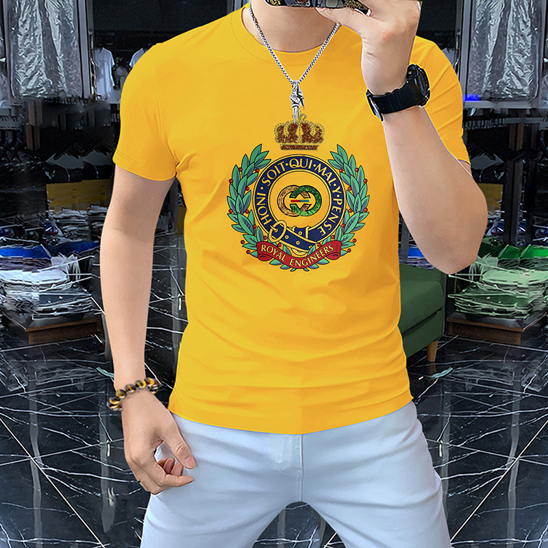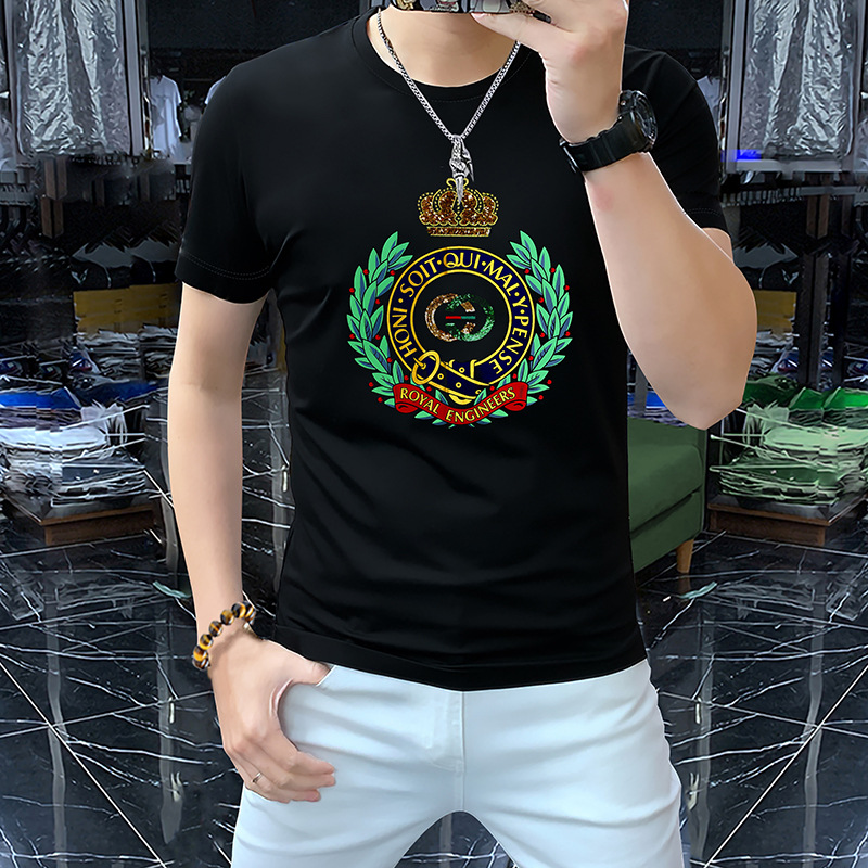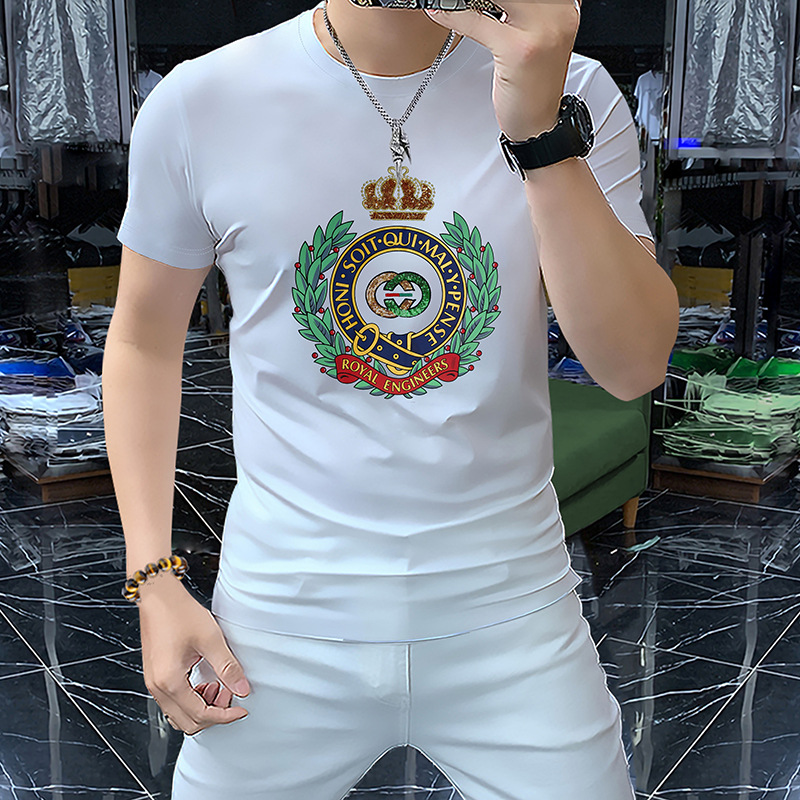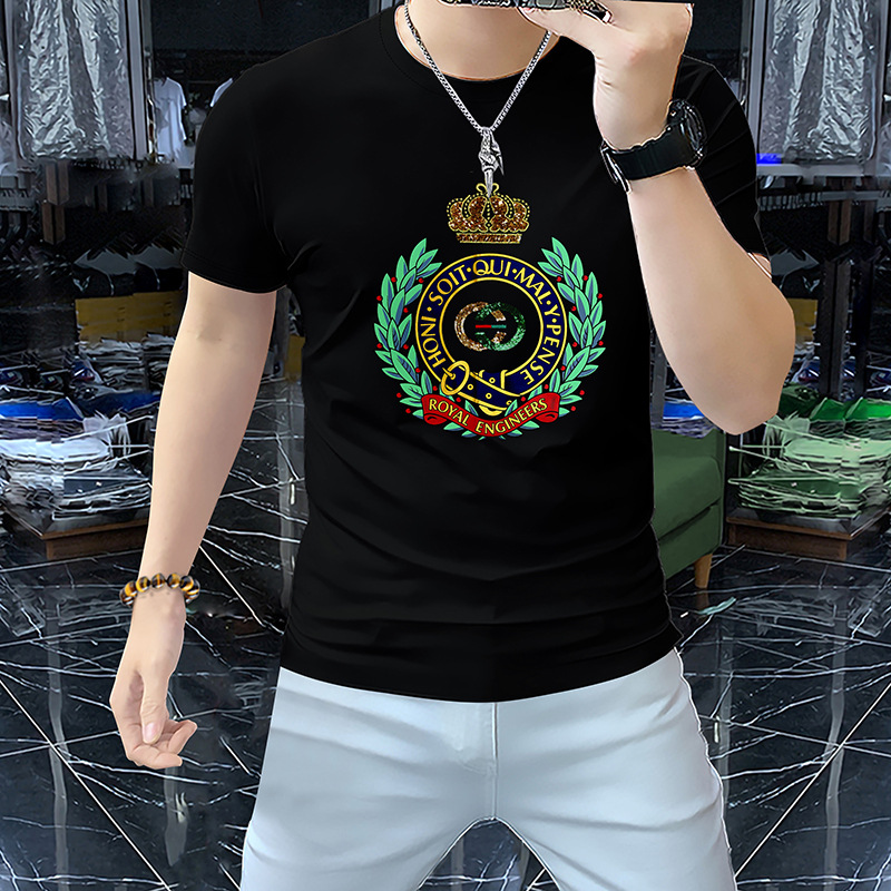 Mercerized 면화 남성용 반팔 티셔츠 2024 세부 정보 새로운 유럽 패션 무거운 자수 청소년 편안한 라운드 칼라 패션스토어 가기