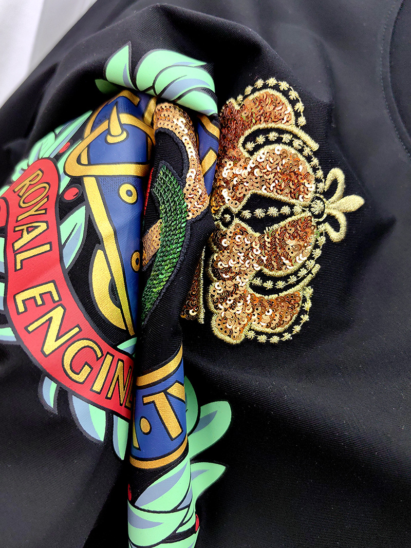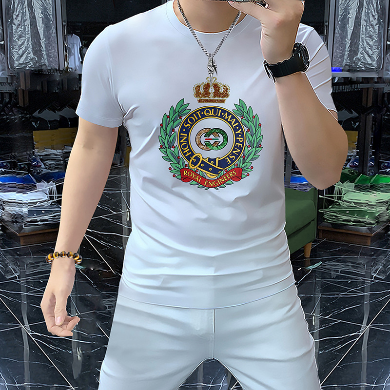 Mercerized 면화 남성용 반팔 티셔츠 2024 세부 정보 새로운 유럽 패션 무거운 자수 청소년 편안한 라운드 칼라 패션